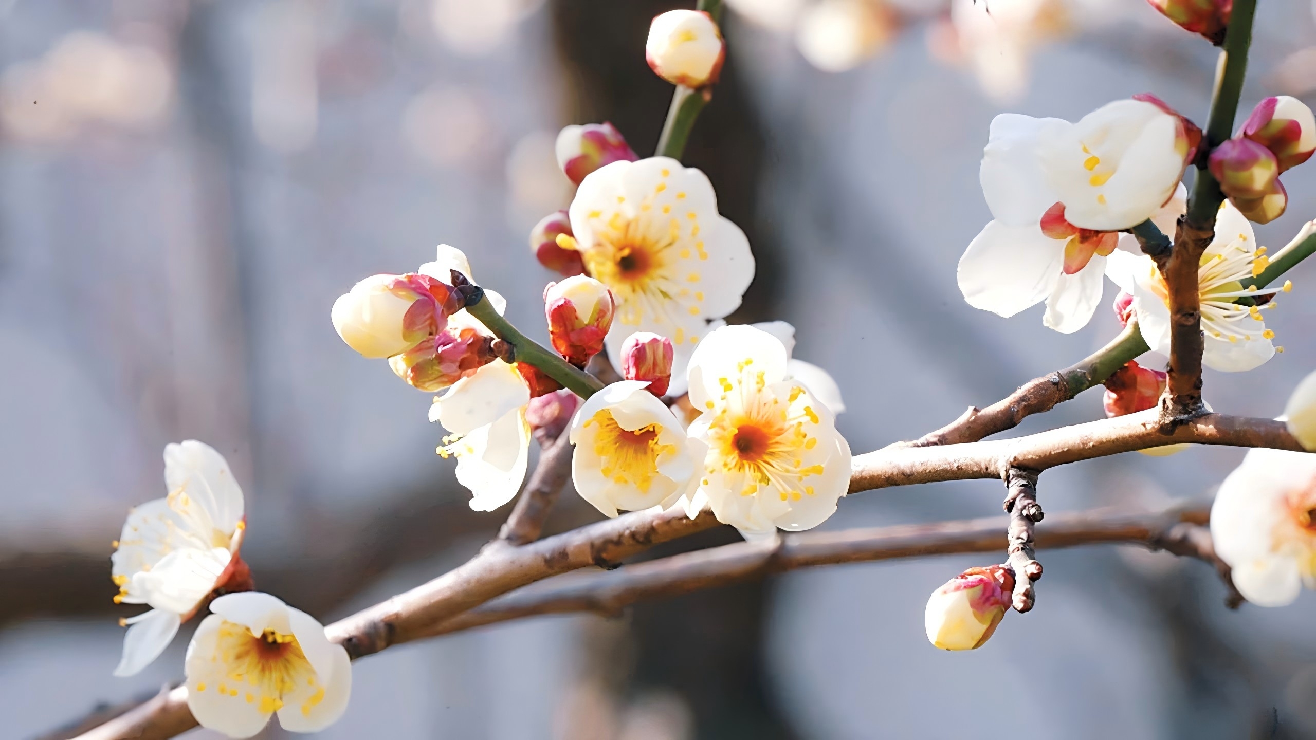 经历了连日的严寒,雪白的江梅已经率先绽放,花瓣晶莹剔透,宛如冬日未融的初雪,它们在枝头轻轻摇曳,散发出淡淡的清香。还有的粉色系梅花已初绽放,在阳光下更显娇嫩。