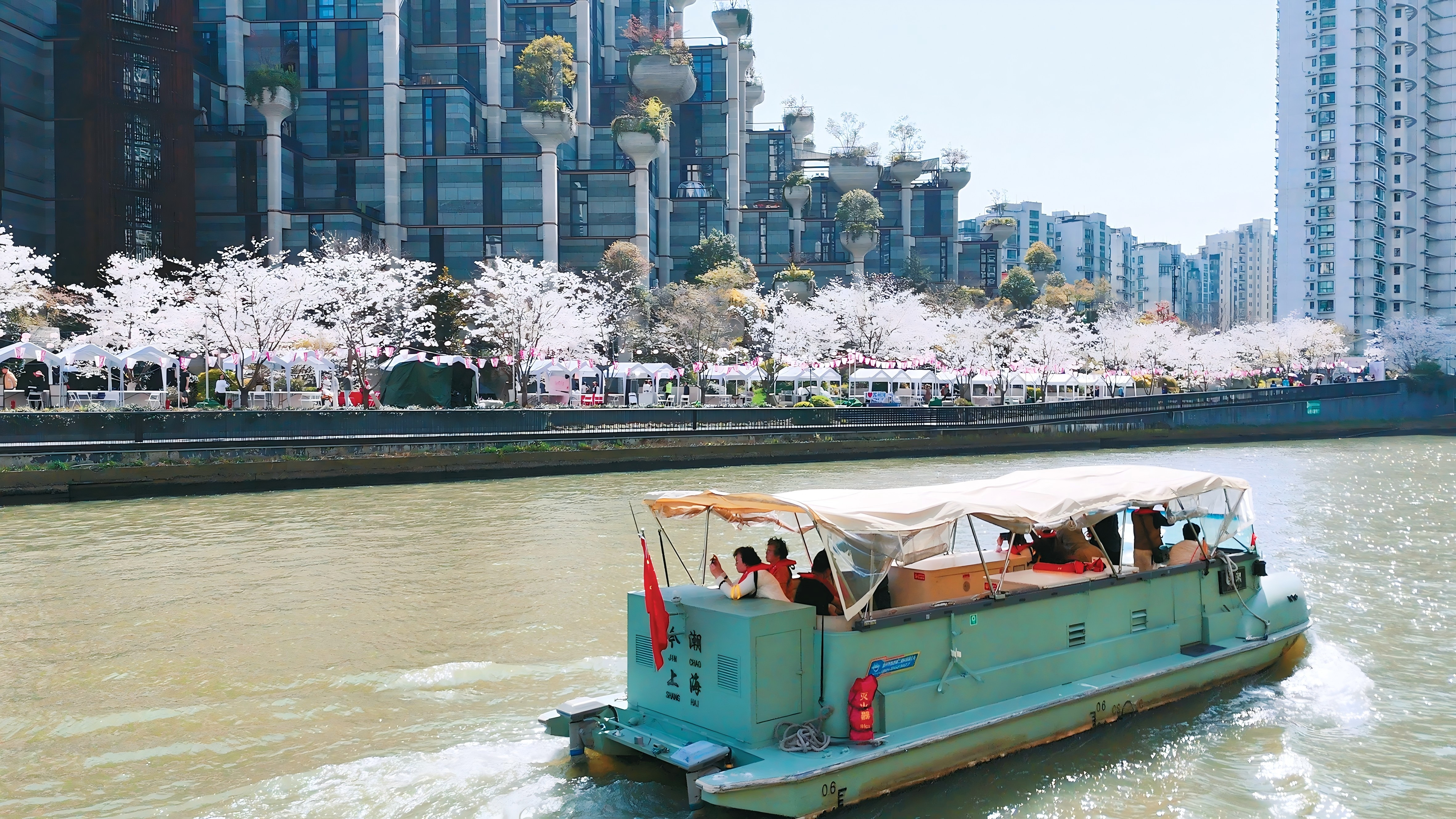 3月21日起,苏州河游船在普陀区昌化路码头独家推出了季节限定“千树樱花季专列”。这艘以樱花粉为主色调的游船采用开放式设计,从昌化路码头出发,沿苏州河缓缓前行,当游船驶至昌化路桥折返时,船长会特意降低船速,让游客能近距离欣赏纷飞的樱花雨。