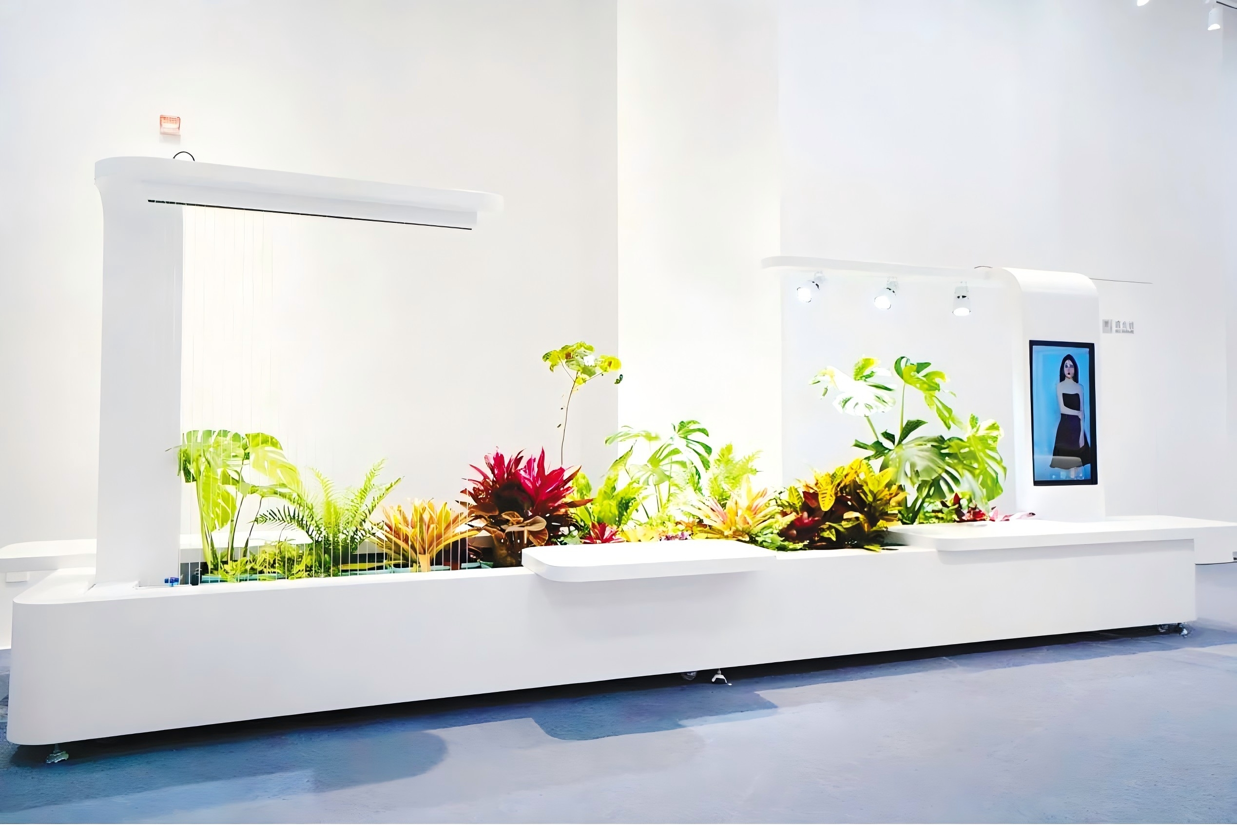值得一提的是,室内展馆的入口处,陈列着由活动主办方专利出品的“三景五能”智能园艺装置,在此自成景观——模拟日光透过自动补光系统倾泻而下,动态水幕实为负氧离子发生装置,蕨类植物在水雾中舒展,形成全自动无需人工浇灌的盆栽景观。科技与非遗穿越时光相遇,却呈现意外的和谐之美,为这场东方技艺的展览带来不一样的生动姿态。
