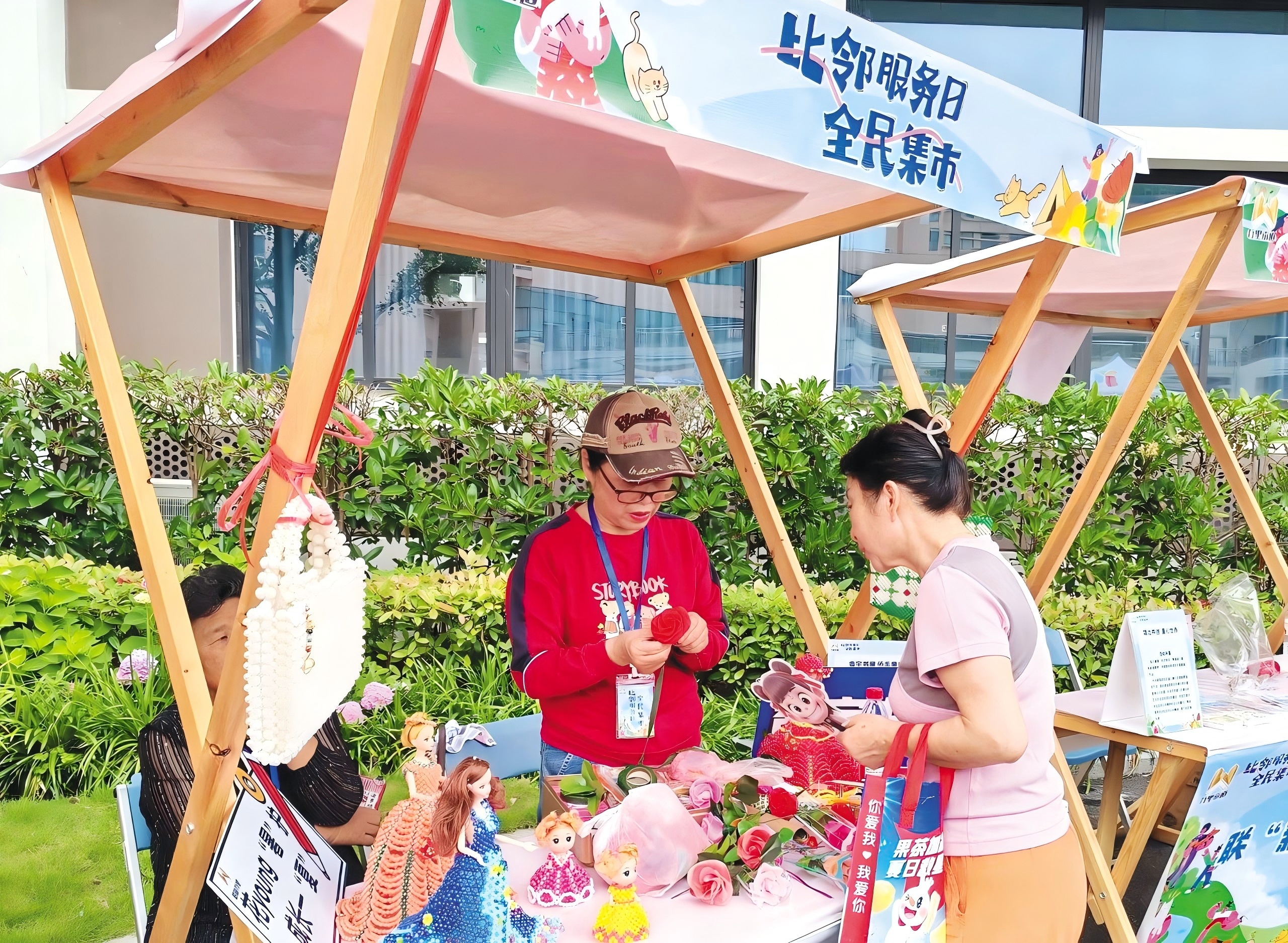(记者 易雯)初夏的微风穿过晋元高级中学校园里繁密的枝叶,吹动着“比邻服务日”市集摊位上的五彩帆布。糖画摊上飘散着麦芽糖的香气,非遗匠人手中的泥塑雏形初具,端午香囊摊位上传来艾草气息。在联“新”公益区,手工串珠摊位的摊主正在和玩具义卖摊位的摊主热络地聊着各自楼组的变化。这是万里街道“比邻服务日”全民市集上的瞬间,也是社区温度的所在(上图)。