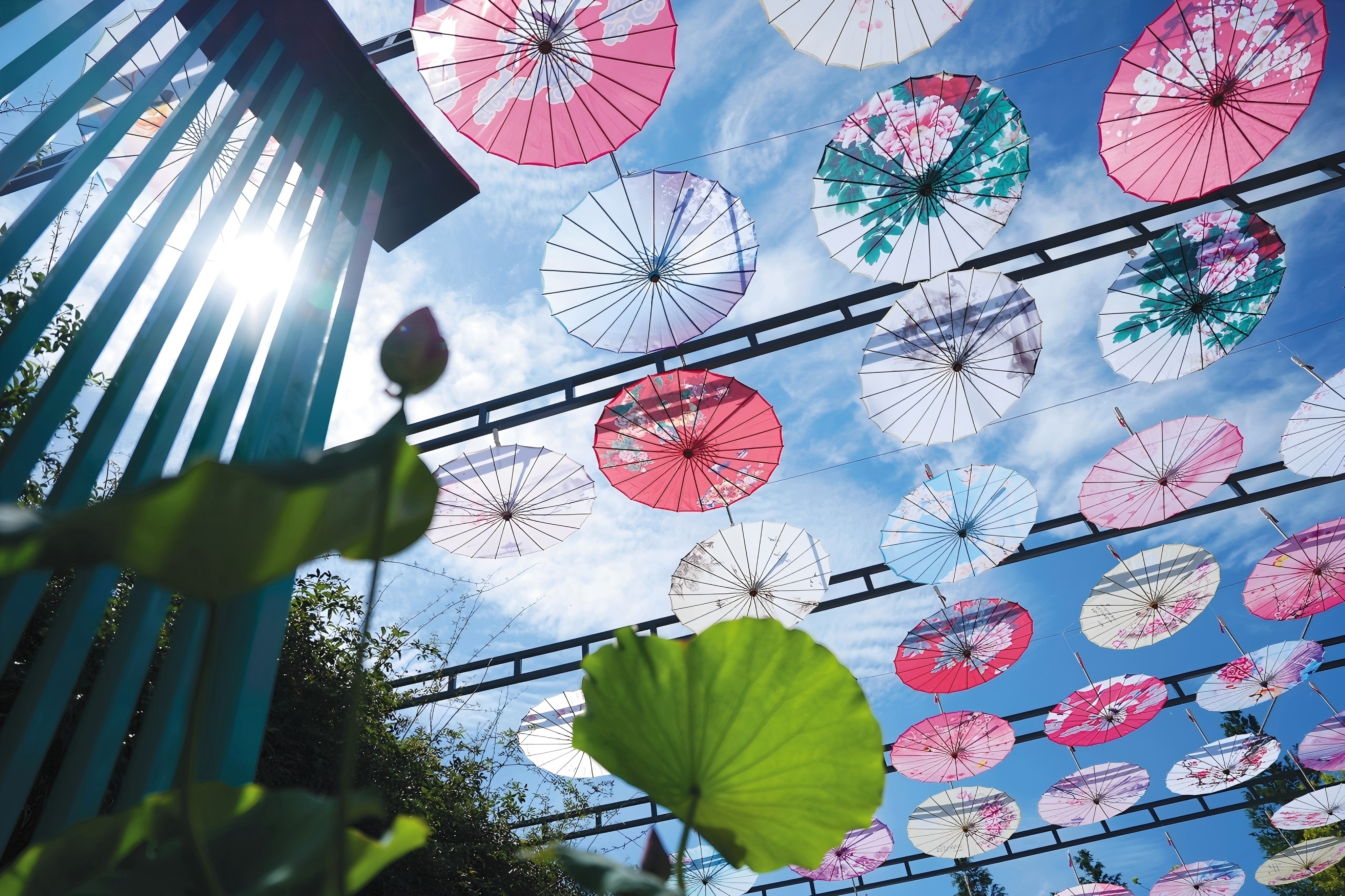 步入公园入口,20余组青瓷荷花缸沿“江南水巷”次第铺展,镂空花柱将斑驳光影投射于青石板路。最引人注目的是百余把倒悬的油纸伞在微风中摇曳,被太阳洒下的斑驳光影笼罩,仿佛在引导游客从都市快节奏过渡至公园里慢慢的荷风雅境。
