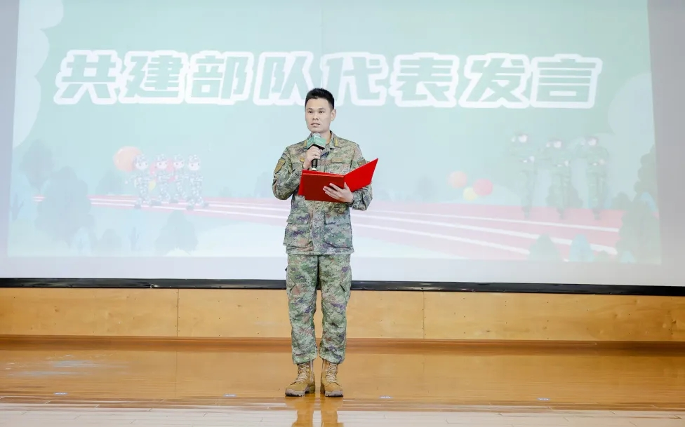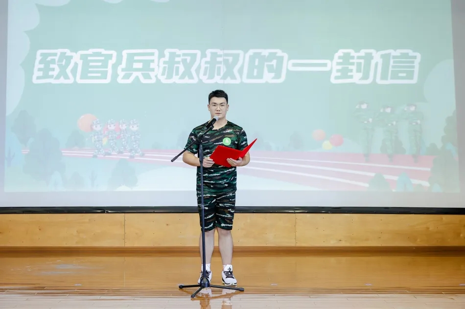 上海市曹杨第二中学费扬同学上台宣读《致官兵叔叔的一封信》,向心目中英勇的解放军叔叔们表达深深的敬意,带领大家共同感受军地一家亲的鱼水情深。