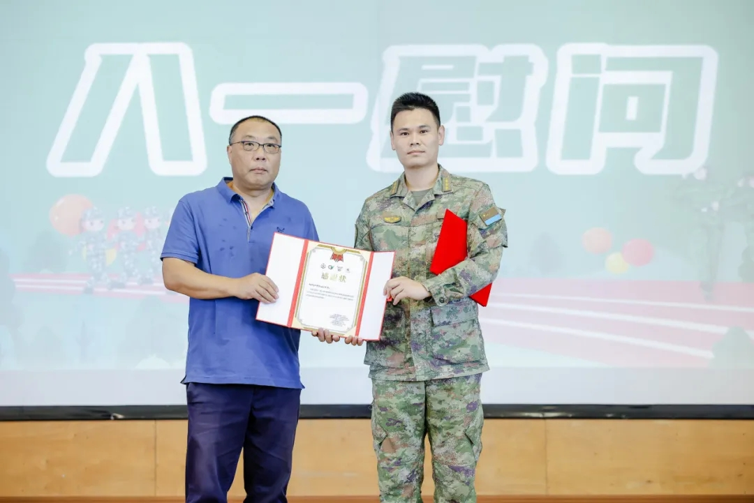 多年来,94969部队60分队一直为曹杨社区所有学校的军训工作辛劳付出,用汗水铸就了同学们的坚强意志。曹杨社区教育发展联盟领导代表、曹杨二中附属学校校长沈霄向共建部队赠送感谢状。