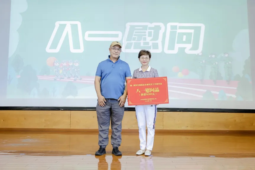 上海泳周餐饮管理有限公司总经理周良向上海市双拥基金会普陀分会副会长李月华赠送夏日慰问礼包。