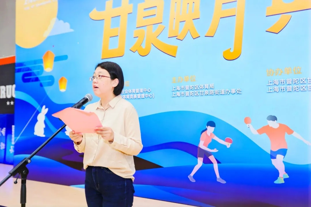 李玮为本次比赛致辞,她表示:“约战普陀”和“普陀·甘泉杯”两大赛事今年再度携手,以“甘泉映月 乒乓团圆”为主题。希望在中秋这个寓意团圆与和谐的节日来临之际,为大家提供一个展示自我、享受运动、感受传统文化魅力的平台。通过“国球进社区”比拼技艺,更分享友谊,共同体验乒乓球带来的快乐与激情。