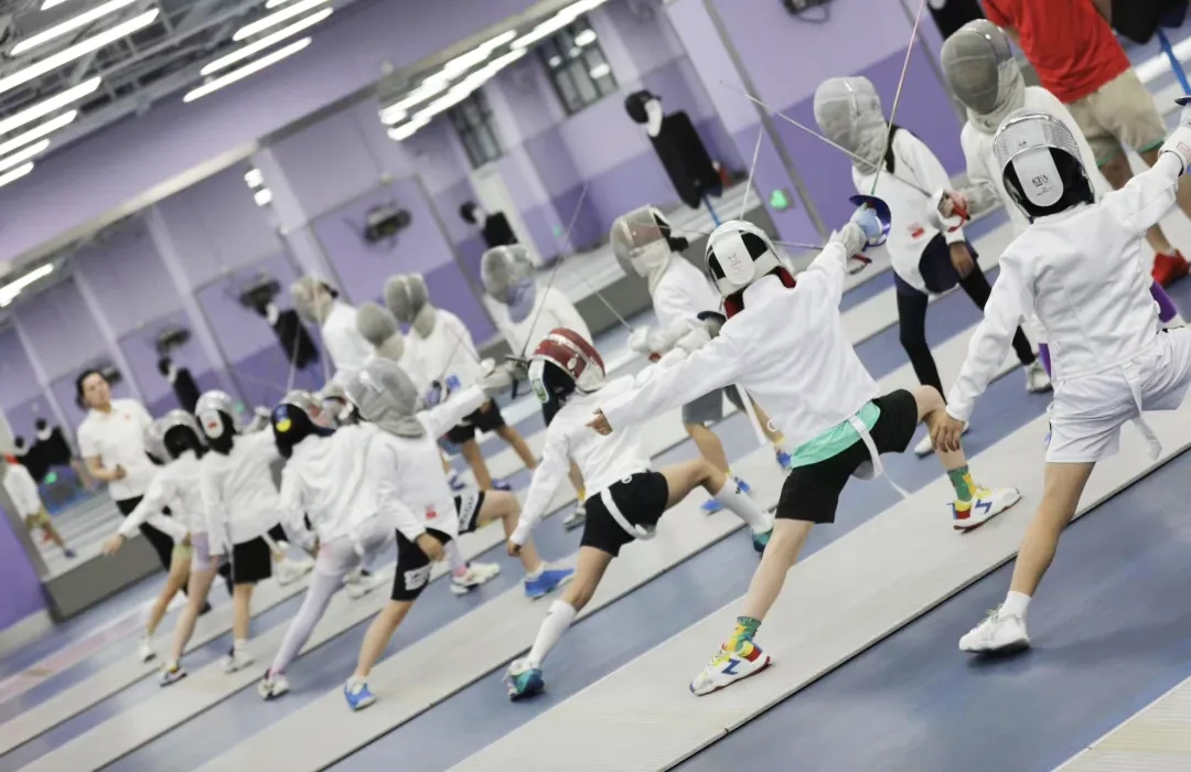 下午两点,普陀体育中心的击剑馆内是一番火热的景象。清脆的金属交击声与教练的哨声此起彼伏,数十名小剑客身着雪白剑服,全神贯注地重复着每一个进攻与防守的动作。