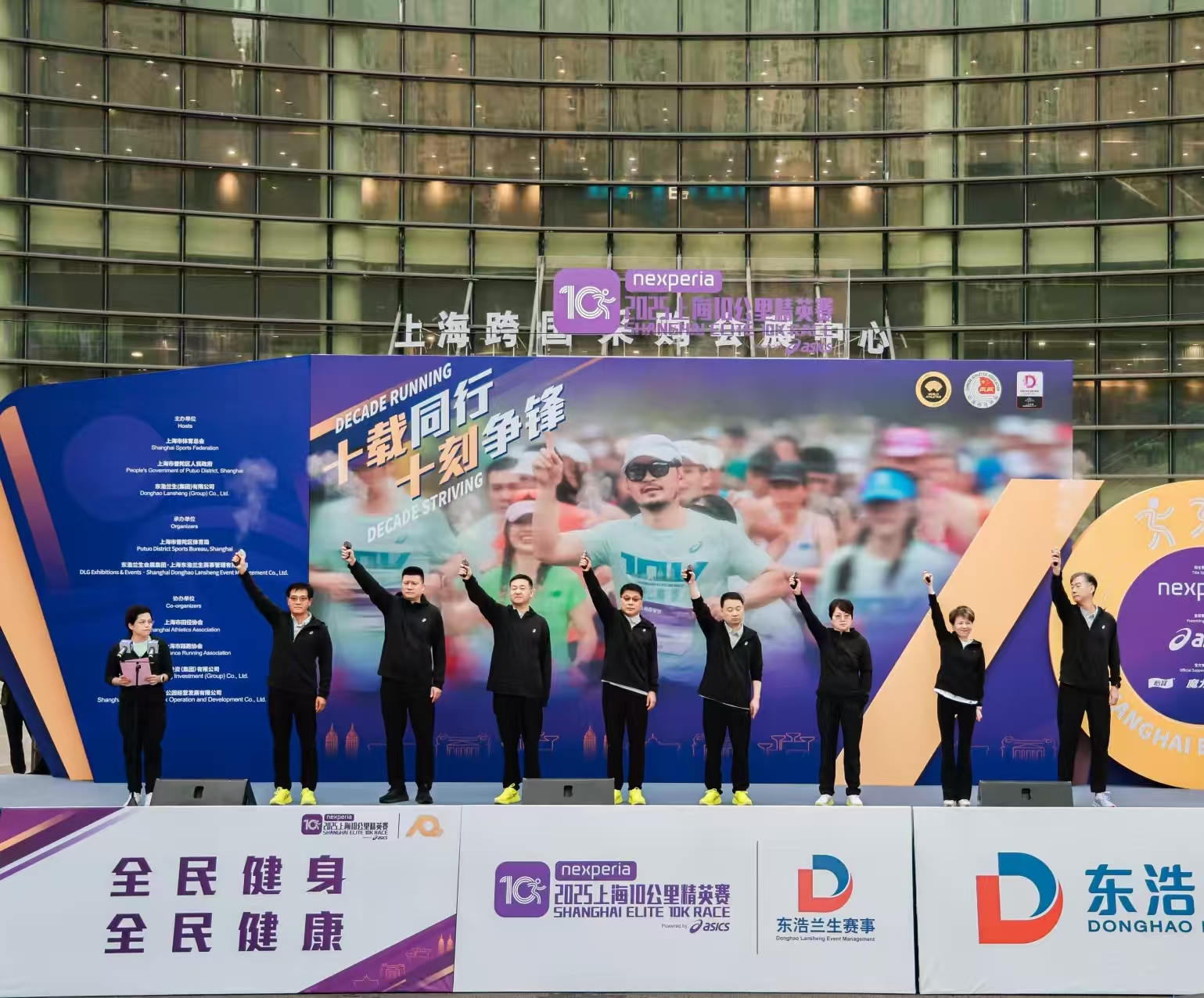 起跑仪式上,区委书记胡广杰,区委副书记、区长赵亮,区人大常委会主任谈上伟,区政协主席杭春芳,市体育局副局长罗文桦,副区长王珏,东浩兰生(集团)有限公司副总裁周瑾,安世半导体(中国)首席战略官张鹏岗,亚瑟士大中华区董事、亚瑟士(中国)总经理黄泽辉等领导及嘉宾共同为2025安世半导体(中国)上海10公里精英赛鸣枪发令。