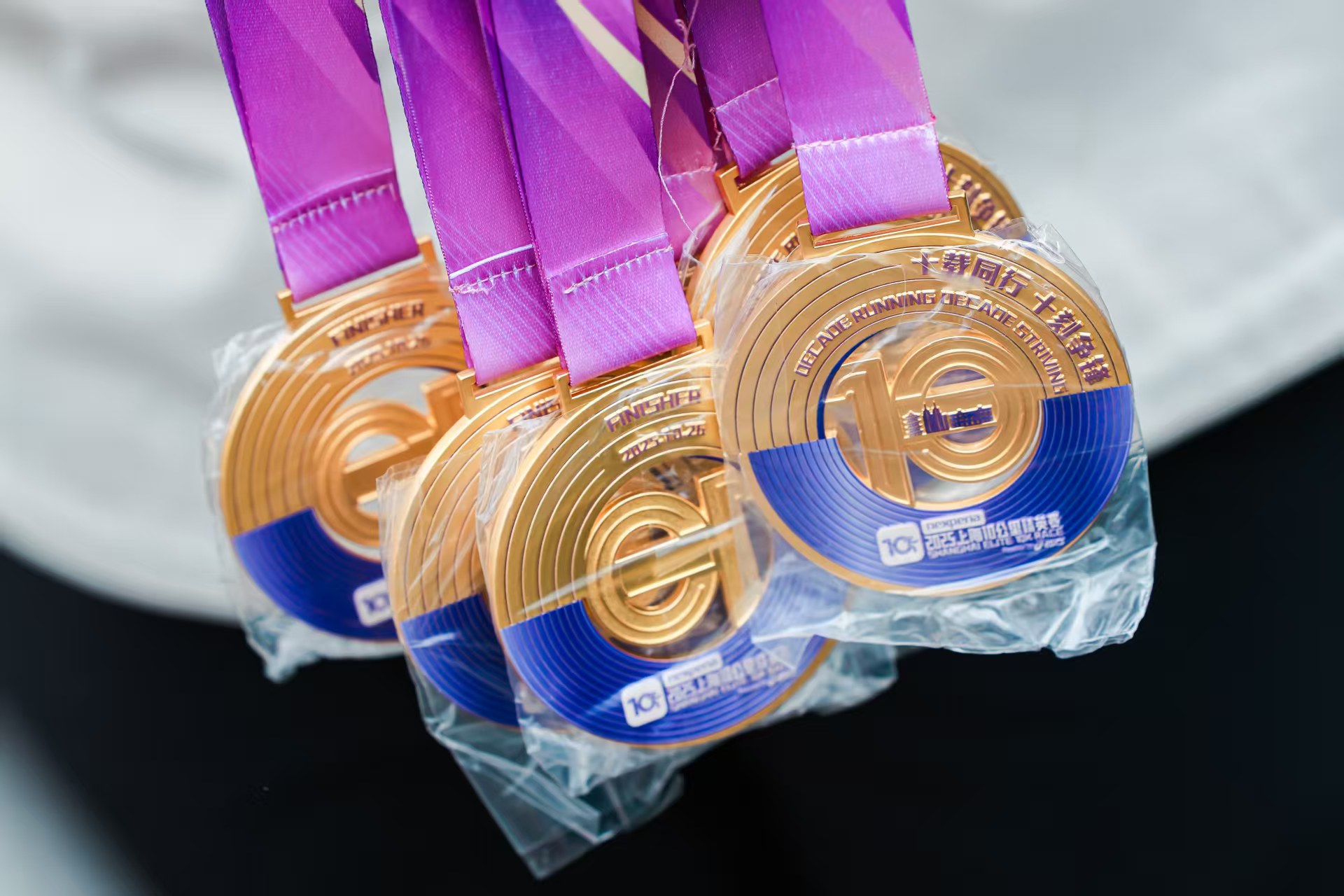 完赛奖牌的设计也独具匠心。奖牌为异型立体设计,镂刻的圆弧线条既代表跑道,又象征精英赛的过往历程。中间镂空部分的数字“10”代表赛事10年成就金标赛事,蓝紫色与金色的搭配凸显比赛的精英气质,同时体现精英赛作为世界田联金标赛事的高品质。