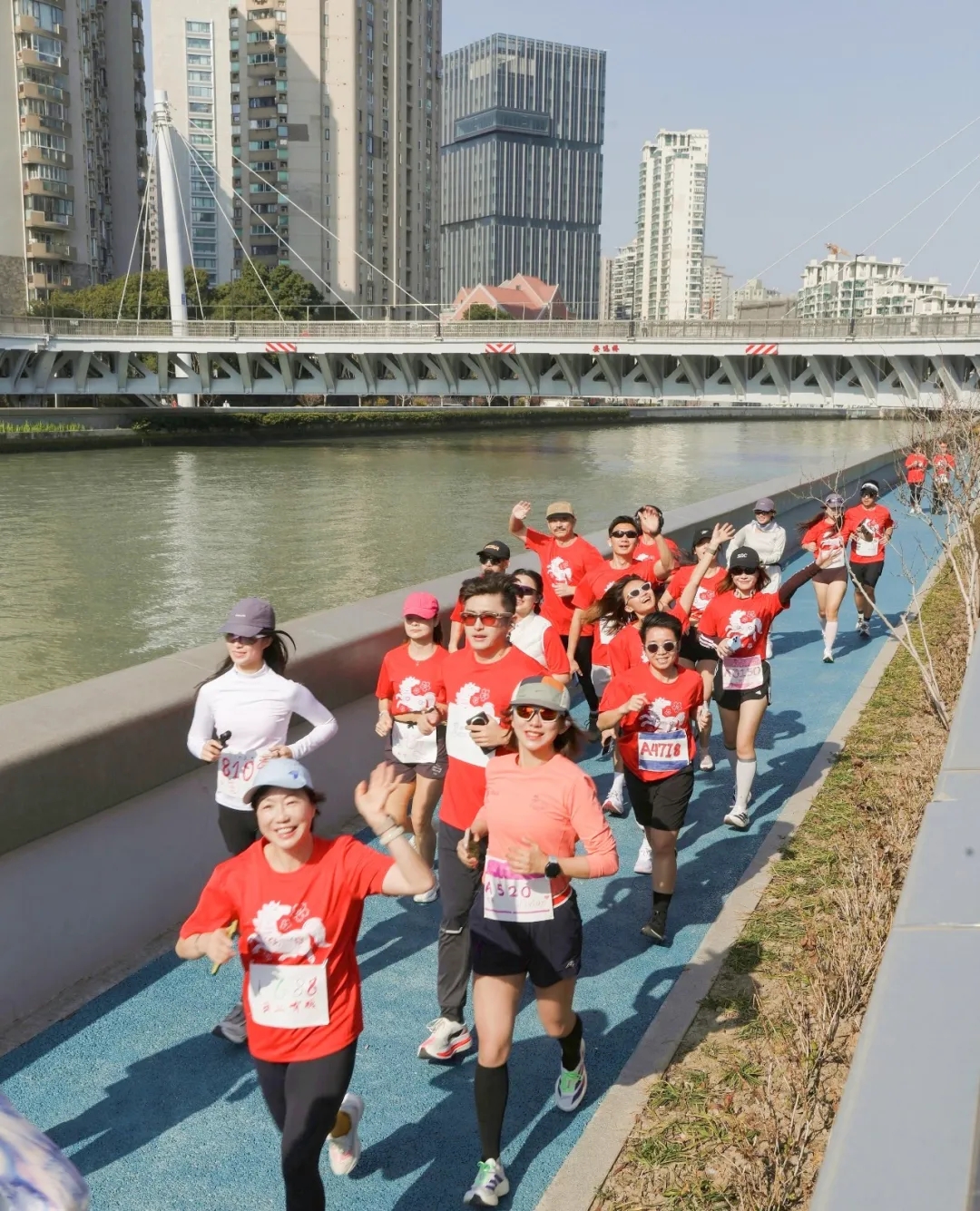 跑者符娜祯身着红色赛事T恤,脸上洋溢着喜悦:“今天天气非常好,沿河风景也特别好。穿上这身红色衣服特别喜庆,跑步时特别有氛围。新年希望自己能跑得更快、动起来更多,认识更多志同道合的朋友。”跑者钱卫敏则带着特别的“装备”前来:“2025年最新的热词是‘爱你老己’,我特意带了一个头纱来参加这个活动。从形式上更加爱自己一些,才能爱别人更多一些。希望新的一年能够跑出更健康的自己。”