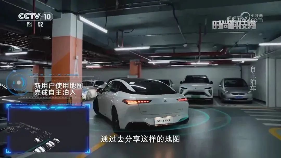 左图:搭载了HoloParking的广汽传祺E9轻松应对地下停车场昏暗环境突发状况;右图:新用户通过分享地图即可完成自主泊入