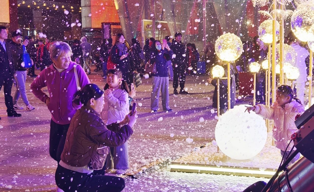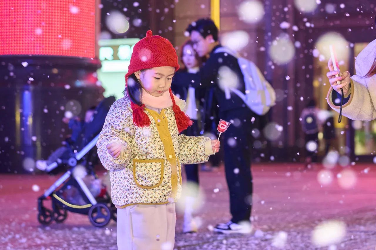 “快看!是雪花!”孩子们在飘雪中嬉戏了起来。情侣们合影留念,老年人也情不自禁加入了拍照打卡的大军。“南方人嘛,满天大雪总归是少见的,虽然是人工的,但也有那味儿了,总归要拍照打个卡的。”一时间,上海环球港的南广场成为了老少同乐的暖意港湾。