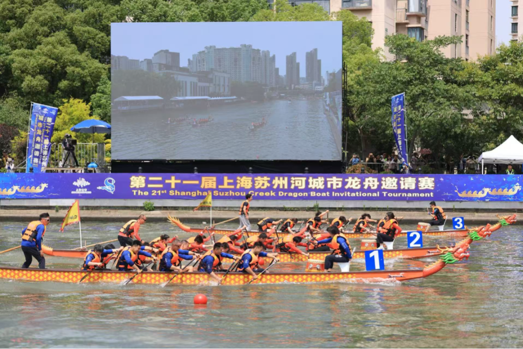 苏州河上,龙舟竞渡、桨影翻飞,欢呼助威声不绝于耳;岸边步道上,悬幡飘扬、人群熙攘,民俗市集吸引着市民纷纷驻足。