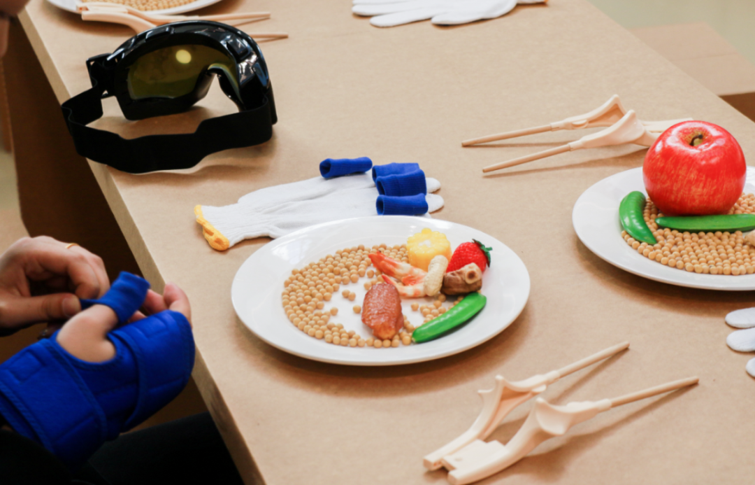 例如,“雾里看花”通过特制眼镜模拟白内障、黄斑病变等视力问题,让参与者在模糊视野中完成寻找药品的任务;“隔音世界”模拟老年性耳聋,考验参与者在模糊指令下的沟通能力;“沉重枷锁”通过穿戴负重设备,体验肌肉流失与关节僵硬带来的行动不便;“指尖隔阂”则通过厚手套与关节限制,再现老人在操作手机、开锁等日常场景中的困难。