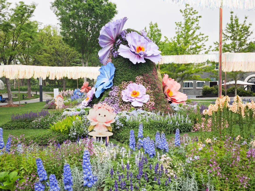 TOP中央公园展点以“满园春色关不住”为主题。开阔的草坪上,模纹花带勾勒出花卉节吉祥物“花宝宝”的形象,远远望去如同一幅天然画卷铺展在绿地上。不少游客一进公园就直奔草坪区域,寻找最佳角度与“花宝宝”合影。市民李沁沁在周六带着孩子来到公园露营:“小朋友非要来看‘花宝宝’,到了现场发现比想象中还要大,用花草拼出的吉祥物形象从高处俯瞰特别有创意。”