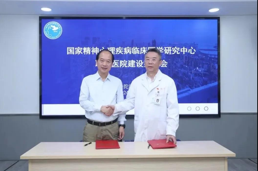 中南大学精神卫生研究所所长王小平与普陀区精神卫生中心院长杨立进行联盟医院合作签约。