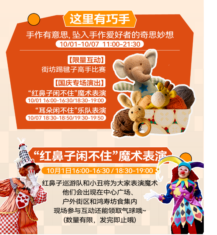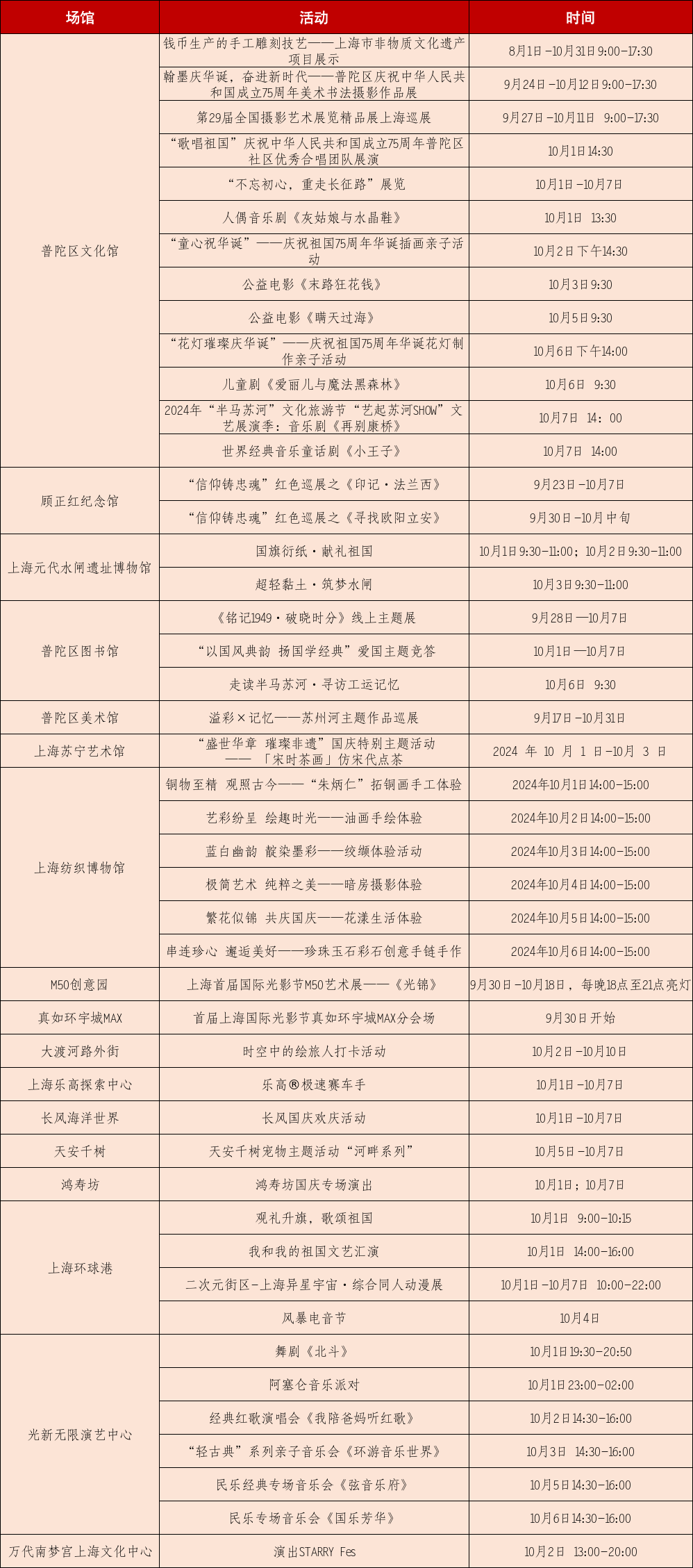 普陀区国庆精彩文旅活动合集 不要走开,下面有您感兴趣的活动详情哦 普陀区文化馆 活动时间:8月1日-10月31日9:00-17:30 活动地点:普陀区文化馆二楼展厅(兰溪路138号) 活动内容:中国古代钱币文化源远流长,本次展览展示钱币生产的手工雕刻技艺于2007年先后入选第一批普陀区非物质文化遗产名录和第一批上海市非物质文化遗产名录。 参与方式:直接到馆参观 2.翰墨庆华诞 奋进新时代——普陀区庆祝中华人民共和国成立75周年美术书法摄影作品展 活动时间:9月24日-10月12日9:00-17:30 活动地点:普陀区文化馆三楼展厅(兰溪路138号) 活动内容:本次展览通过文学、美术、书法、摄影、艺术品收藏等艺术形式,集中展现在中国共产党的领导下取得的伟大成就。 参与方式:直接到馆参观 3.第29届全国摄影艺术展览精品展上海巡展 活动时间:9月27日-10月11日 9:00-17:30 活动地点:普陀区文化馆一楼城市创艺空间 活动内容:题材上既反映中国式现代化等宏大主题,又观照到质朴真实的人间烟火、百姓故事,还展示了摄影人在镜头之后的体悟和感受。 参与方式:自行参与 4.“歌唱祖国”庆祝中华人民共和国成立75周年普陀区社区优秀合唱团队展演 活动时间:10月1日14:30 活动地点:普陀区文化馆五楼小剧场 活动内容:来自普陀区各街道、镇的合唱团的歌者们用歌声传递爱国情怀,用旋律编织美好祝愿。 参与方式:组织参与+文化普陀云平台在线预约 5.不忘初心,重走长征路展览 活动时间:10月1日-10月7日 活动地点:甘泉社区文化活动中心(延长西路350号) 活动内容:用图文的形式展现了90年前,红军战士脚穿草鞋,夜渡滔滔于都河,开始了万里长征。跋山涉水、九死一生,用生命和热血绘就了改变中国前途命运的史诗。 参与方式:现场参与 6.人偶音乐剧《灰姑娘与水晶鞋》 活动时间:10月1日 13:30 活动地点:甘泉社区文化活动中心(延长西路350号) 活动内容:上海木偶剧团首部人偶音乐剧。该剧紧贴当下的主题立意,人物形象生动活泼,剧情充满幽默感,有好听的音乐和美丽的舞蹈以及美轮美奂的舞台呈现。 参与方式:甘泉文化云报名 7.“童心祝华诞”——庆祝新中国75周年华诞插画亲子活动 活动时间:10月2日下午14:30 活动地点:普陀区文化馆二楼207教室(兰溪路138号) 活动内容:为庆祝新中国75周年华诞,普陀区文化馆举办插画艺术活动,让孩子在轻松愉快的氛围中学习和感受祖国的伟大。活动由专业老师现场指导,共同创作独一无二的艺术作品。 参与方式:通过“文化普陀云”APP报名参加 8.公益电影《末路狂花钱》 活动时间:10月3日9:30 活动地点:普陀区文化馆五楼小剧场 参与方式:文化普陀云平台在线预约 9. 活动时间:10月5日9:30 活动地点:普陀区文化馆五楼小剧场 参与方式:文化普陀云平台在线预约 10.“花灯璀璨庆华诞”——庆祝新中国75周年华诞花灯制作亲子活动 活动时间:10月6日下午14:00 活动地点:普陀区文化馆二楼207教室(兰溪路138号) 活动内容:喜迎祖国75周年华诞,普陀文化馆诚挚的邀请市民大手牵小手,一起参加“花灯璀璨庆华诞”花灯制作主题亲子活动,传承中华优秀传统文化,享受亲子欢乐时光。动手制作花灯,用色彩点亮节日,用创意点亮生活,用灯笼传递祝福,用光明照亮未来! 参与方式:通过“文化普陀云”APP报名参加 11.儿童剧《爱丽儿与魔法黑森林》 活动时间:10月6日 9:30 活动地点:桃浦北部党群服务中心(连冠路196号) 活动内容:一位叫爱丽儿的小姑娘和她的森林小伙伴们,在正义使者的帮助下,用七种正义的力量,打败了邪恶的坏公主。今天的故事,就让我们从爱丽儿说起...... 参与方式:现场参与 12.2024年“半马苏河”文化旅游节“艺起苏河SHOW”文艺展演季:音乐剧《再别康桥》 活动时间:10月7日 14:00 活动地点:普陀区文化馆五楼小剧场 活动内容:环境戏剧版歌剧《再别康桥》是国内首部“小剧场歌剧”。该剧以林徽因为主线人物,其最大的价值在于对林徽因真实生平的艺术化展现,赋予了人物深厚的历史感和真实感。 参与方式:“文化普陀云”平台在线预约 13.世界经典音乐童话剧《小王子》 活动时间:10月7日 14:00 活动地点:万里社区文化活动中心(真金路51号) 活动内容:小王子用他的善良换来了友谊和信任,蟒蛇和狐狸也终于明白,贪婪、自私不能拥有一切,真正的友谊来自内心的真诚,快乐的真谛是爱与担当,跨越星球寻找的答案原来就在我们身边。 参与方式:现场参与 顾正红纪念馆 1.“信仰铸忠魂”红色巡展之《印记·法兰西》 展览跟随留法勤工俭学生的足迹,拼凑出留法勤工俭学运动过程,并重点讲述龙华英烈(蔡和森、向警予、奚佐尧、赵世炎、佘立亚、陈延年、陈乔年、颜昌颐)的故事及其在旅欧党、团组织成立和发展中发挥的重要作用,描绘出他们跨越千山万水、历经千锤百炼,坚持真理、坚守理想的壮丽篇章。 活动时间:9月23日-10月7日 活动地点:顾正红纪念馆 参与方式:现场参与 2."潮涌苏河·工运影迹"巡展 巡展共分四大板块,分别是《苏州河畔·沪西春雷》、《工运摇篮·二月罢工》、《顾正红案·五卅风暴》和《三次起义·抵制斗争》等内容,以时间为纵轴,以事件为横轴,通过丰富的史料、30余幅图片,旨在重现20世纪初至大革命时期的这段历史,让参观者身临其境般体验那段峥嵘岁月,从而加强对党的早期革命历史和工人阶级斗争的认识。 活动时间:9月30日-10
