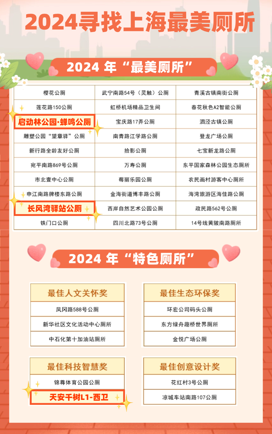 11月12日,由上海市文化和旅游局、上海市绿化和市容管理局共同主办的2024年寻找上海“最美厕所”征集活动日前揭晓,全市共有30家获评2024年上海“最美厕所”,普陀有2家厕所上榜;10家获评2024年上海“特色厕所”,其中1家位于普陀。 快来一睹这三家获奖厕所风采吧! 长风湾驿站公厕 长风湾驿站公厕位于半马苏河公园2号绿地游艇码头旁,新古典主义风格的外观设计与苏河两岸环境相得益彰,全天候为市民游客提供便捷、整洁的如厕体验。 智慧平台系统对公厕内部的空气质量、温湿度、蹲位使用情况、客流量等指标数据进行实时监测并显示,让使用者和管理者都能对公厕运行情况一目了然。 空气净化系统、智能温控系统的设置,以及公厕适老适幼无障碍设施升级,为市民游客营造了安全、舒适的全天候如厕环境。 智能节水装置、采光结构设计、内部环保装饰材料的整体运用,在确保公厕环境整洁明亮的同时, 进一步降低能耗,践行绿色低碳的理念。 “如居家般温馨的管家式”服务模式,得到了市民游客的广泛好评。“高温蒸汽清洁机”“多功能洗地机”“瞬吸式擦窗机”等新型保洁工具,代替了传统的抹布、拖把,在提高保洁效率的同时,对公厕进行深度清洁与消毒杀菌。市民在如厕时享受到更加干净、舒适的环境,科技助力让生活更美好。 小小公厕,虽不起眼,却是人民城市不可或缺的一隅;它不仅是城市功能的细微展现,更是为民服务、传递温暖的明亮窗口。身处于繁华的上海滩,漫步在美丽的苏河畔,长风湾驿站公厕以其独特的设计和贴心的服务,致力于为每一位到访者提供美好舒心的体验。 启动林公园·蝉鸣公厕 启动林公园·蝉鸣公厕,巧妙地将自然元素融入城市建设之中,开创了全市首个以“蝉”为主题的生物多样性科普厕所新篇章。这座公厕不仅搭载了先进的智慧管理系统,实时显示使用情况和空气质量,设计了适老适幼化设施,并融入了休憩、社交、教育等多重功能,展现了新颖的自然文化内涵和卓越的公共空间体验品质。 蝉鸣公厕以展现上海特有的蒙古寒蝉、蟪蛄和黑蚱蝉三种蝉为核心,精心打造“听蝉鸣”“观蝉画”“学科普”“悟禅意”四种意境,让市民游客在如厕之余,也能领略到蝉文化的独特魅力。其中,独特的声感互动装置设计更是别出心裁,只需轻轻触动按钮,便能聆听蝉鸣等自然声音,唤起人们对童年的美好回忆和对大自然的无限遐想。 通过营造模拟生态环境,蝉鸣公厕将公共厕所的趣味性与公园的优雅环境完美融合,不仅提升了市民游客的如厕舒适度和体验感,更增强了他们对大自然生物多样性的认知和环境保护意识,为普陀区的城市建设增添了新的亮点和活力。 天安千树L1-西卫 天安·千树建筑造型灵感来源于连绵的黄山,作为商业综合体不可或缺的空间,洗手间整体设计呼应天安·千树独特的“山形”设计,在保证空间美观的同时,将科技智慧融入使用场景,在细节之处尽显人文关怀。 天安·千树L1-西卫以个性精致的艺术画作为点缀装饰,在用心营造艺术空间同时,不忘洗手间的本质功能,紧抓隐私与实用。起伏式的墙面设计保证了隐私性,营造出充分的放松氛围;为保证实用性则设置了全自动感应式洁具,为市民提供了贴心的免接触设计,重新定义了公共空间的洁净体验,真正做到了用科技给予人文关怀。