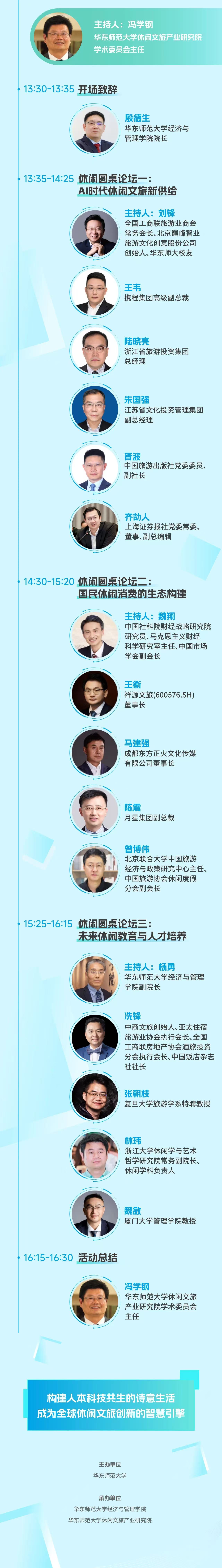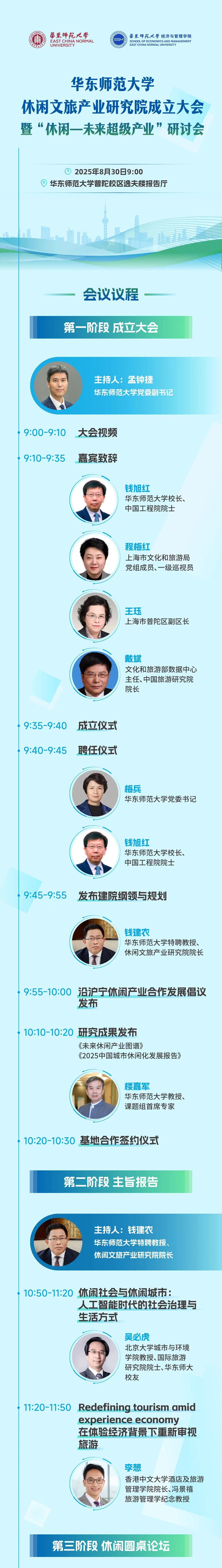 大会亮点抢先看—— 巅峰阵容 大咖云集 活动邀请国家及地方相关部门领导、国内外休闲领域顶尖专家学者、全球休闲产业领军企业百余名代表齐聚一堂,通过主旨报告、圆桌论坛等多维度对话与深度研讨,汇聚政产学研多方智慧,共商休闲产业发展趋势,共绘休闲经济未来蓝图,为推动休闲产业高质量发展凝聚共识、贡献力量。 戴斌,经济学博士、教授。现任第十四届全国政协委员,中国旅游研究院院长、文化和旅游部数据中心主任。全国优秀教师,享受国务院特殊津贴。多次主持国家科技重大、国家社科重大和重点项目,主持和参与2008年以来国家旅游业发展规划、法律法规政策研究和文件起草工作,两次获得联合国世界旅游组织政府创新奖,多次获得部以上政府表彰和奖励。主要研究领域:国家旅游发展理论、旅游经济与旅游政策,出版专著、教材、文集20余部,发表论文和专业文章540余篇。担任《旅游评论》主编、编委会主任,兼任人大复印资料《旅游管理》编委会主任、东北财经大学、河南大学兼职教授,博士生导师,福建、西藏、杭州、福州等省市人民政府发展顾问。 吴必虎,北京大学城市与环境学院教授、国际旅游研究院院士、国际旅游学会终身创会主席、文化和旅游部“十四五”规划专家委员会委员、中国旅游协会专家委员会执行主任、世界旅游城市联合会专家委员会委员、游历图书馆创始人。吴必虎教授在旅游发展理论研究领域著作等身,已正式发表论文400余篇,出版专著10余部,是人文地理和旅游研究领域在国内外权威学术期刊上发表学术论文数量最多的学者之一,其中《旅游规划原理》已成为旅游学科经典教材。他提出的城市居民出游距离衰减规律、环城游憩带、文化遗产活化、恋地主义原真性和游历研究框架等方面的研究成果,都已在政府决策支持和行业发展应用领域获得广泛接受并在多场景得以应用。 李想,香港中文大学酒店及旅游管理学院院长,冯景禧旅游管理学纪念教授,曾在美国任教近20年。研究重点包括目的地营销、旅游者行为和心理,发表论文书章逾270篇,荣获30多项研究奖项,全球旅游与酒店顶级期刊论文发表数量最多及该领域引用率最高的学者之一。现任Tourism Management副主编, 及十多家期刊编委,并担任旅游与旅游研究协会(TTRA)的第一副会长。他曾与世界旅行旅游理事会、多国政府旅游部、协会和国际企业等机构合作。 品牌成果 重磅发布 大会现场将发布华东师范大学休闲文旅产业研究院最新研究成果《未来休闲产业图谱》与《2025中国城市休闲化发展报告》。 《未来休闲产业图谱》立足全球休闲产业发展趋势与中国本土实践,通过大数据分析、案例调研与学术论证,系统梳理休闲产业核心业态、产业链布局及未来增长点,形成未来休闲产业的可视化图谱,为政府部门制定产业政策、企业布局投资方向、学术机构开展研究提供权威数据支撑与决策参考。 《2025中国城市休闲化发展报告》是华东师范大学2011年以来连续第15年发布中国城市休闲化发展水平报告。课题组对国内城市休闲化水平进行跟踪研究,已成为我国有关休闲城市建设测度方面延续时间最长、较权威的研究报告之一。 合作倡议 共谋发展 响应时代召唤,肩负教育强国使命。在大会上,华东师范大学休闲文旅产业研究院将正式向社会发布研究院的理念、愿景使命与学科、人才、产业三大纲领,推出“三城汇”人才交流与培训合作品牌项目。 同时,华东师范大学将联合上海市普陀区,携手南京、无锡、常州、苏州、南通、扬州、镇江、泰州等沿沪宁产业创新带城市,共同发起“沿沪宁休闲产业合作发展倡议”,聚焦休闲产业发展关键领域,共同构建一个开放、协同、共享的合作平台,为长三角更高质量一体化发展提供坚实支撑。