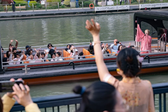 清明小长假,春风拂面,上海文旅市场迎来了一波强劲的“春日经济”热潮。全市三天接待游客739.76万人次,同比增长5.64%。而在普陀区,全区重点景区客流量同比增长49.4%;宾馆酒店平均客房出租率达64.6%,同比增加2.1个百分点。其中,一场以苏州河游船为核心的“水上春宴”更是火爆出圈——连续两天刷新单日客流纪录,文商旅联动下的春日消费活力澎湃。 24小时内两破纪录,苏州河游船“火”了 4月4日,清明假期首日,悠游苏州河开出散客航班55班,上座率89%,创下2022年开航以来的单日客流新高。然而,这个纪录仅保持了不到24小时——4月5日,散客航班增至56班,上座率跃升至93%,纪录再度被刷新。整个小长假,苏州河游船共开出165班,客流量同比上涨11%。 游船为何“一票难求”?答案在于“水岸联动”与“产品持续上新”——船上吃烤鸭、水岸对唱,甚至能带上宠物,游船体验“卷”出了新意。 今年清明,苏州河游船推出多款主题航班。最吸睛的是“春日演艺航班”:6班全部满座,上座率100%。当游船行至千树沿岸900米河滨步道,船上音响关闭,岸上同步响起歌声,船上歌手与岸上歌手隔水对唱,游客一边赏花一边跟唱,水岸呼应的沉浸式场景令人叫绝。 “春日晚宴航班”首次与天安千树内的青年公社烤鸭餐厅合作,厨师在船上现场片鸭,热腾腾的桂花香酥烤鸭端上餐桌。三天开出3班,上座率86%。同期推出的樱花季下午茶航班,联合Azul意大利餐厅,上座率同样100%。 此外,苏州河游船还特别开设“宠物专属航班”,专门针对爱宠人士与自家“毛孩子”一同登船赏春。宠物在灿烂花海中的合影,迅速成为社交平台上的热门话题。 游船的火爆离不开岸上的“神助攻”。天安千树商场同步举办春日市集,30多个文创手作、轻食饮品摊位沿花树排开。凭当日苏州河游船票,可在千树商场免费停车一小时(持续至4月19日),形成“上船前逛市集、登船后赏风光、下船后进商场”的完整消费闭环。清明假期,天安千树客流同比增长30%,营业额同比增长25%。 长风板块喜迎长三角亲子踏春热 除了水上游船,普陀区的亲子景点同样客流高涨。清明假期三天,全区重点景区景点客流量同比增长49.4%,宾馆酒店平均客房出租率达64.6%,同比提升2.1个百分点。 坐落于长风公园内的长风海洋世界是国家4A级景区。假期里,鲨鱼甬道、鳐鱼星空、企鹅馆等热门场馆客流如织,3月底全新推出的“海马酒店”成为儿童教育科普的活态课堂;而一路之隔的长风大悦城的上海乐高探索中心,则用十周年优惠福利覆盖了整个假期。拥有11个主题互动区、用超过390万块乐高积木搭建上海都市景观模型的乐高中心,成为亲子家庭的“必打卡地”,据场馆方统计,假期三天接待外地游客人数同比增长21%。 与此同时,普陀长风板块正借助长三角春假的红利,吸引大量周边城市家庭。清明期间,上海成为江苏等地春假客群的溢出承接地。从无锡自驾而来的家长王林,带着两个孩子上午在上海乐高探索中心拼搭积木,下午乘游船畅游苏州河,他表示:“两天一夜,大人孩子都玩得很尽兴。”