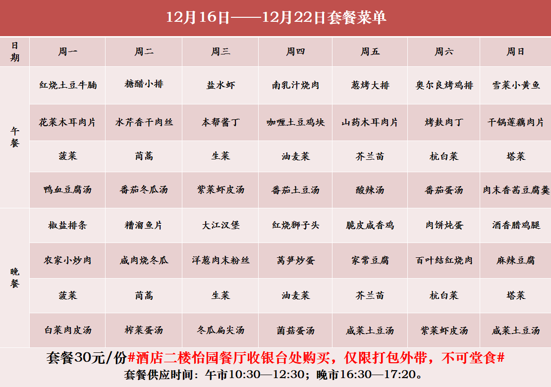 亲爱的居民:自2024年12月1日起,因酒店经营需要,对部分经营场所进行调整,可以打包带走,不可堂食。
