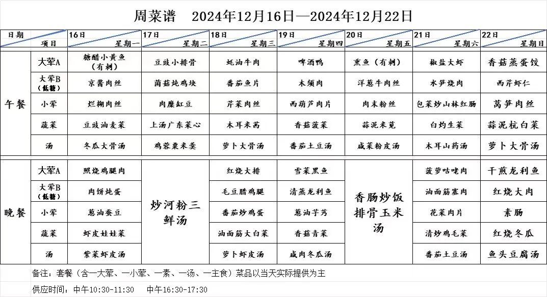 周三:东坡肉、炸猪排、红烧鲫鱼、水煮虾、白切鸡、糖醋排骨、西芹虾仁炒蛋、干锅土豆条、白菜豆腐、香菇青菜、三色豆芽、时蔬