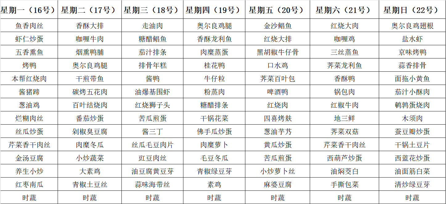 周四:东坡肉、清蒸鱼块、蒜蓉虾、糟熘鱼片、奥尔良鸡翅、青椒素肠炒肉片、四喜烤麸、西葫芦炒蛋、烂糊肉丝、家常豆腐、香辣包菜、时蔬