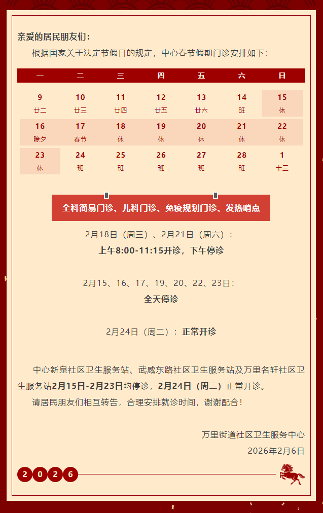 万里社卫丨春节假期门诊安排通知