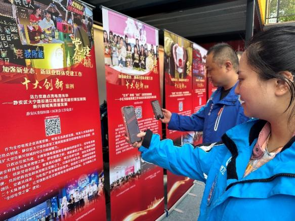 活动现场,党群中心工作人员引导新就业群体们参观“加强新业态、新就业群体党建工作十大优秀案例、十大创新案例”展览,向他们详细介绍了每个案例的特色与创新点,让小哥们了解上海新业态、新就业群体党建工作的凝聚力与创新力,同时让小哥们真正体会到政府对他们的用心。小哥们仔细聆听,不时用手机扫一扫案例二维码进行深入了解、热烈讨论。一位小哥感慨而言:“本以为来上海打工会过得很艰辛,没想到我们在上海的‘家’会那么好,那么多‘家人’一直在关心着我们,我们也一定会把社区当成自己的家园,为‘家’的建设尽自己的一份力量。”