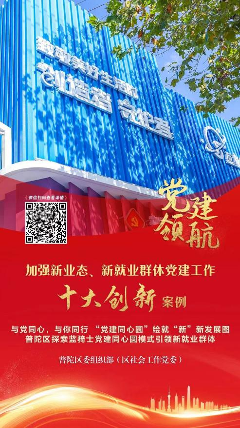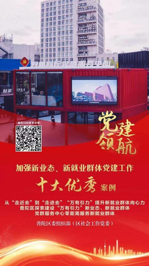 近日,党建领航·加强新业态、新就业群体党建工作优秀案例发布会在上海举行,其中普陀区《从“走近去”到“走进去” “万有引力”提升新就业群体向心力 普陀区探索建设“万有引力”新业态、新就业群体党群服务中心 零距离服务新就业群体》荣获“十大优秀案例”,《与党同心,与你同行 “党建同心圆”绘就“新”新发展图 普陀区探索蓝骑士党建同心圆模式引领新就业群体》荣获“十大创新案例”。
