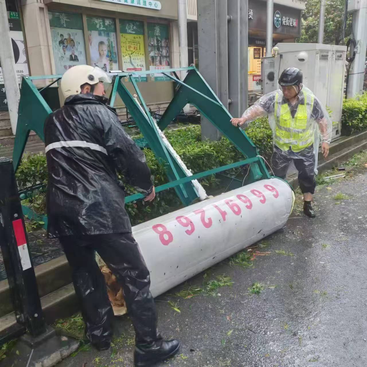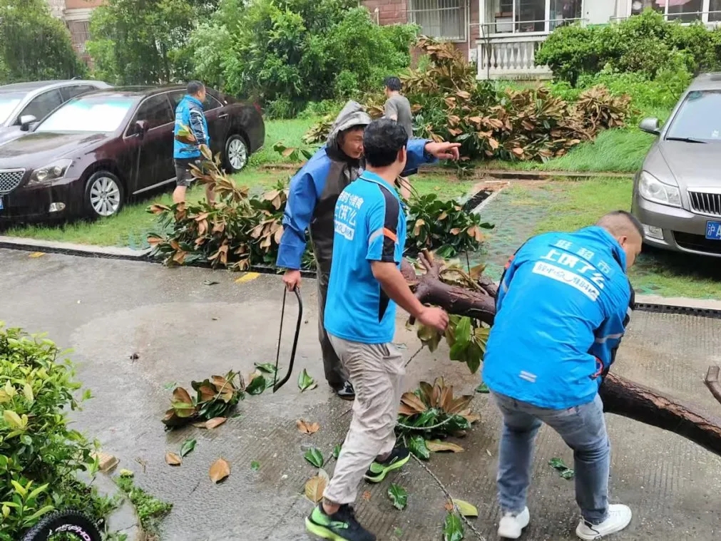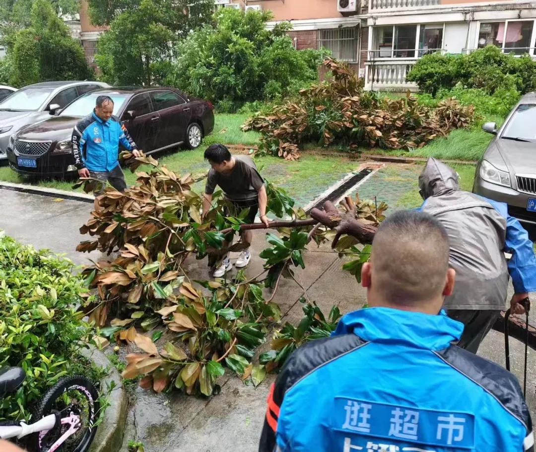 正在万有引力新就业党群中心值守的第一网格中浩云街区党支部书记陈浩发现鑫都佳园小区,立即向万有引力城市建设者管理者之家新就业群体志愿服务队发出求助,志愿服务队接到请求后立即响应,三名志愿者冒着风雨赶到小区,第一时间与小区工作人员一起开展清理工作。“我喊口号1、2、3,起!”清理过程中,三人与工作人员分工合作,成功将倒塌树木转至安全地方。