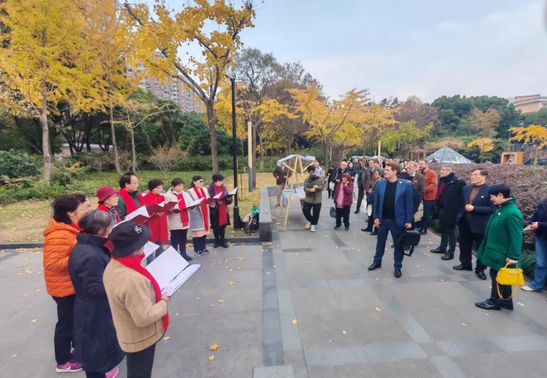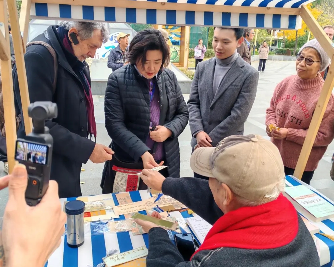 朗诵会前,中外诗人首先来到万里公园的诗歌市集,感受诗意。社区居民们和来自进华中学的学生们为诗人们赠送诗歌书签,佩戴上银杏叶胸针,邀请中外诗人们一起体验非遗制作技艺——掐丝绒花和植物拓染,聆听诗歌朗诵,感受中华文化的独特魅力。万里辖区的学校学生与诗人在万里公园银杏林相互交流对诗歌的理解,沉浸式感受诗意万里。