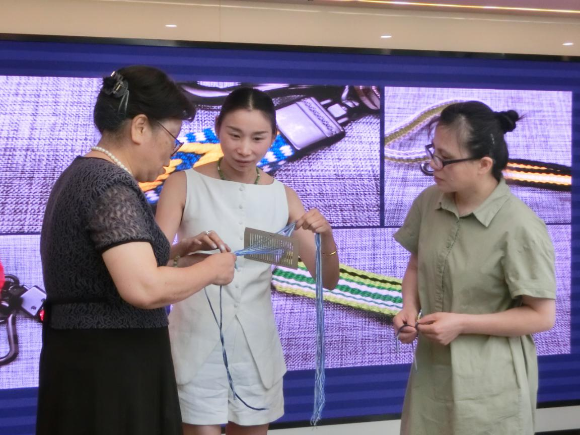 在座谈中激扬思维火花,在手作中感受非遗魅力。上海纺织博物馆赵莉君副部长的梭织绦带手作示范刚结束,居民们便两人一组围坐案前,五彩纱线在指间穿梭。不同民族、不同年龄的参与者默契配合,蓝色象征包容,红色代表热情,黄色寓意团结,一条条交织着多元色彩的绦带逐渐成形。
