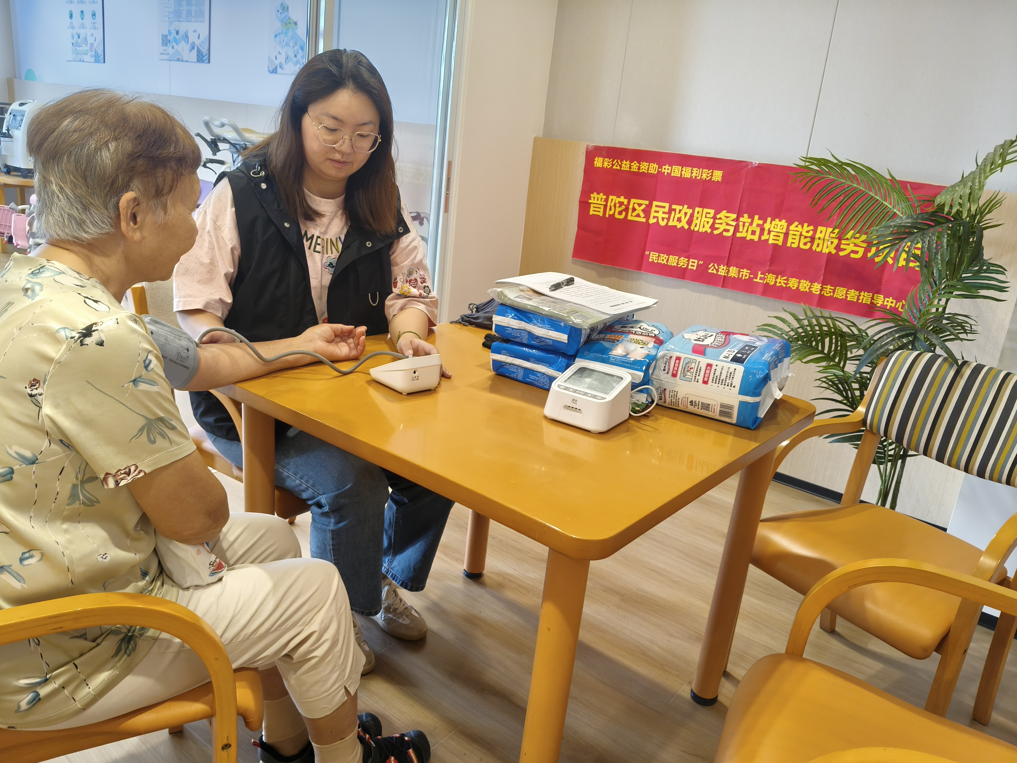 除了“从头到脚”的形象打理,服务站还设置“健康服务角”,提供免费量血压、体质检测服务。工作人员为老人记录数据,针对血压偏高、体重异常等情况,给出饮食、作息及运动建议,让老人在家门口就能掌握自身健康状况。