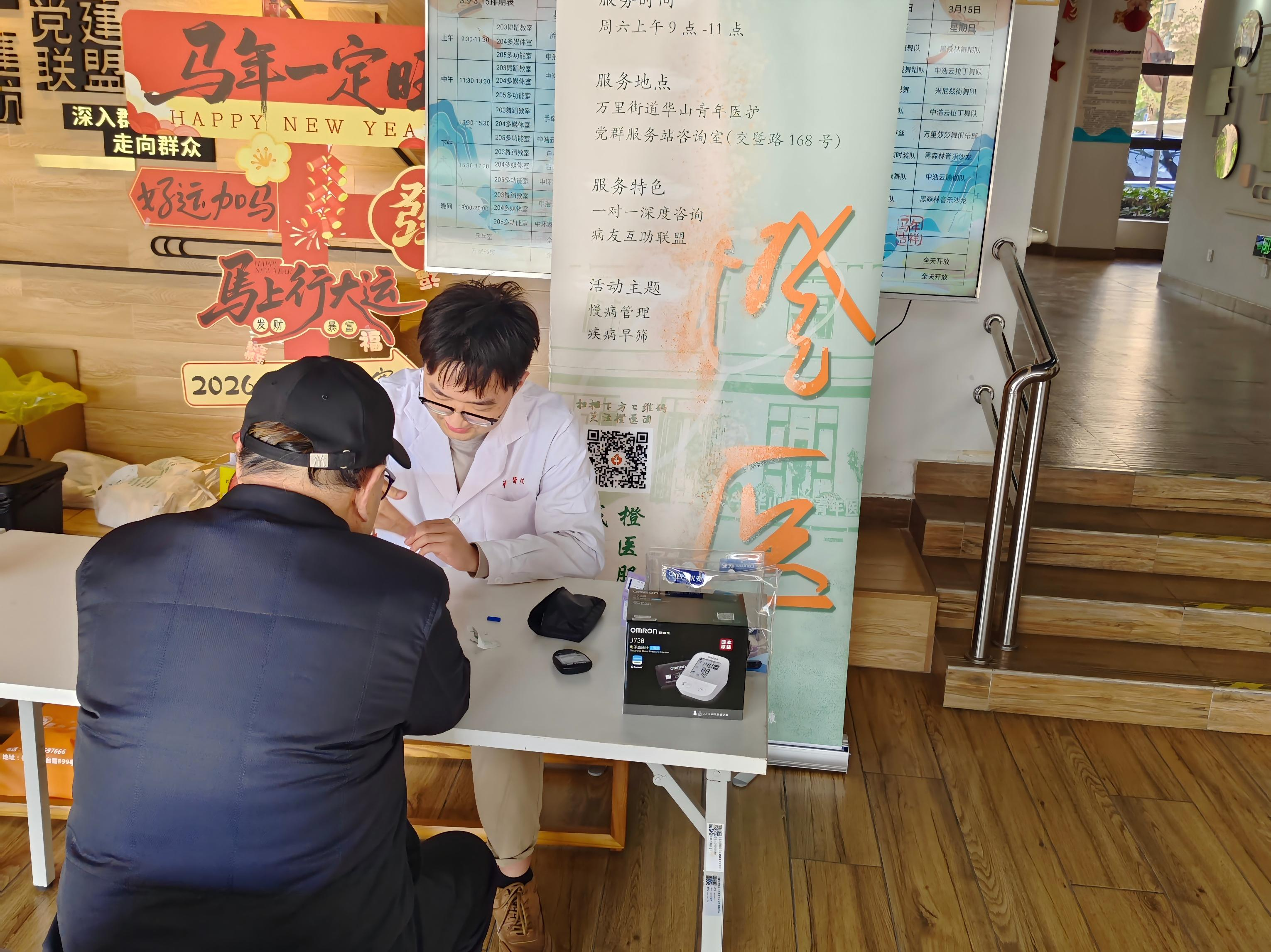 2026年03月19日 来源: 万里街道2025年11月,位于万里街道交暨路168号的华山医院青年医护之家正式落成,华山青年医护党群服务站同步启用,不仅为青年医护提供了安居之所,更许下了一份惠民育青的温暖承诺。今年2月,区国资公司、万里街道、华山医院、中环集团携手汇聚政、校、医、企资源,正式启动华山青年医护党群服务站共建,同步成立“橙医健康护航服务团”。一支由华山医院神经内科、皮肤科、老年医学科等十余个专业、三十多名硕博医学生组成的志愿团队,从此与万里街道结下了守护健康的约定。近日,这份约定有了新的回响。中浩云党群服务中心内,穿着白大褂的年轻身影让这个已融入居民日常的社区空间多了一份特别的暖意。在华山青年医护党群服务站这一固定服务点的基础上,橙医团首次将来自三甲医院的专业志愿力量延伸至片区,让青年医护走出象牙塔,离社区烟火气更近一步。