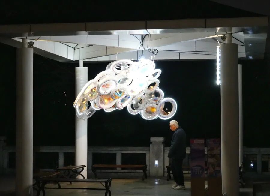 灯光艺术季的一个核心展区,位于万里公园中央喷泉周围的六座亭子。作品由社区规划师刘毅联动万里协同创新工作室、专业艺术家、社区居民、学校师生等共同创作。“让传统手艺在社区‘活’起来,是大家的共同初衷。”悬挂于亭檐下的作品《竹编星环》以细密的竹丝编织出圆形、四芒星等几何形态,通过内置光源穿透竹编,在地面投下层次分明的光影。当市民闲坐亭中,既能触摸手编工艺的自然质感,又能感受传统文化融入生活日常。