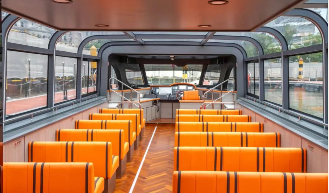 本次沿沪宁主题航班选用了朱红色游船“创享”,内部采用排排坐的形式,可以在船上欣赏各市带来的特色风情演艺,欣赏苏河两岸美景。