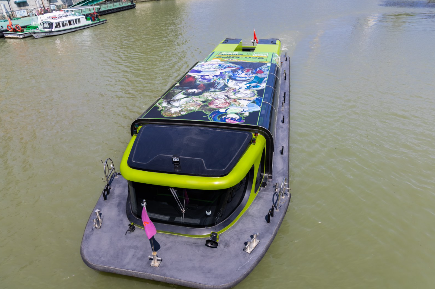 半透明船膜设计兼顾舱内观景体验与岸上视觉冲击,船顶巨幅动漫贴膜化作流动的城市文化地标,实现水岸景观与次元美学的有机共生,让市民游客在“船行画中”的独特体验里,感受动漫赋予城市水岸的崭新活力。