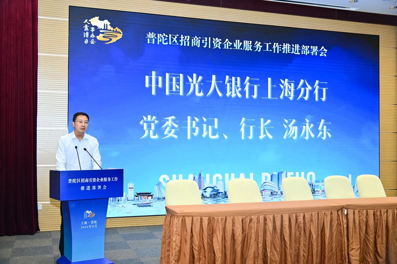 来源: 上海普陀为深入贯彻落实党的二十届三中全会和上海市招商引资企业服务工作推进部署会精神,更好推动普陀高质量发展和现代化建设,8月22日,普陀区招商引资企业服务工作推进部署会举行。中国光大银行上海分行党委书记、行长汤永东,中国光大银行上海分行党委委员、副行长杜奕;普陀区委书记姜冬冬,区委副书记、区长肖文高,区人大常委会主任谈上伟,区政协主席杭春芳,区领导刘东昌、李荣华、张伟、魏静、吴朝阳、厉蕾、蒋龙、周如意、付乐欣出席。