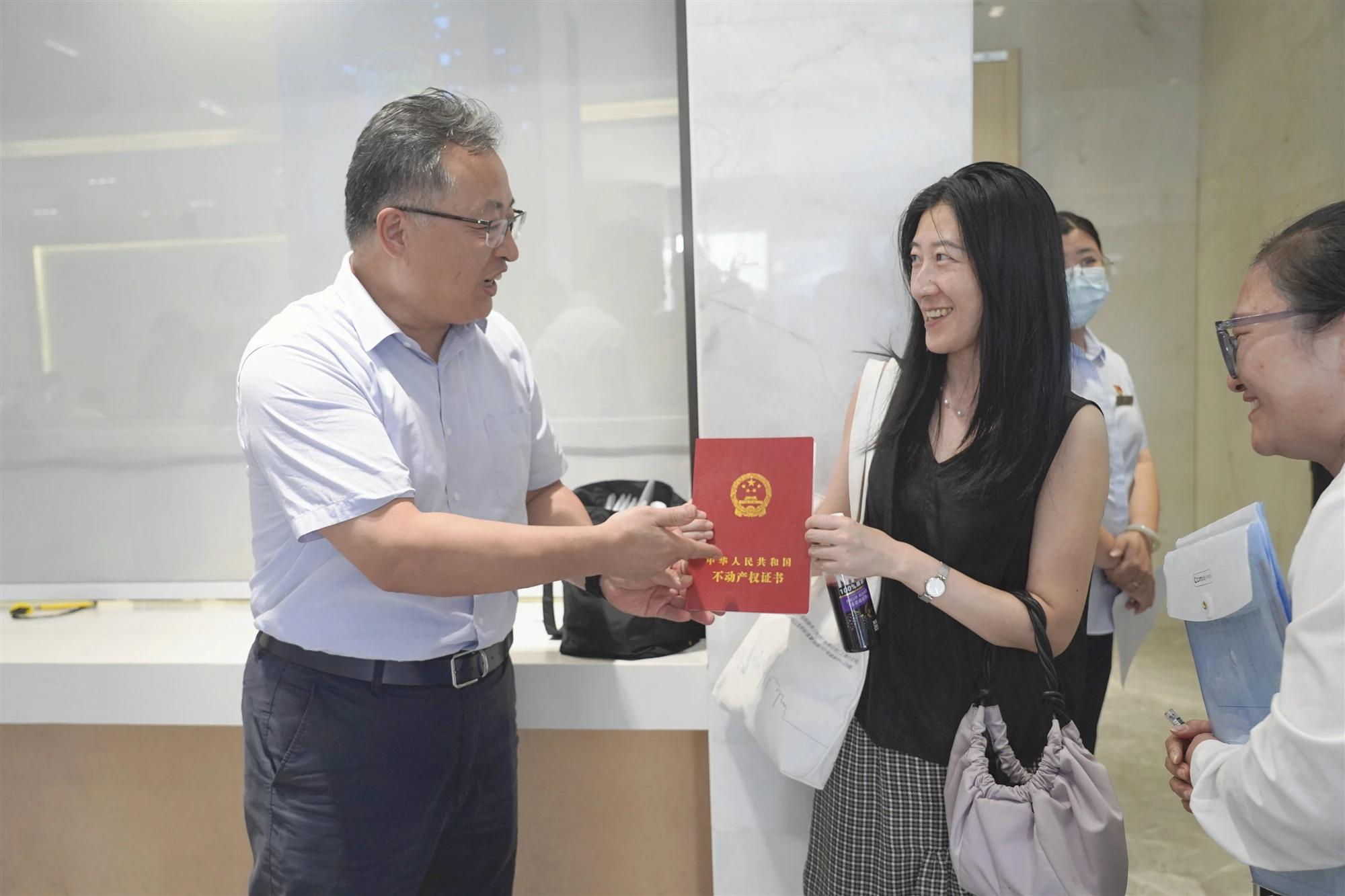 当天,魏子新来到不动产登记交易大厅,详细了解了不动产登记“一件事”专窗帮办、长三角“跨省通办”体验等服务事项,同时陪同市民办理,亲切询问市民办事体验。市民汪女士在陪同下办理了房屋买卖“一件事”业务并体验了“税费同缴”服务。刘女士通过“一网通办”平台,将登记费和税费合并支付,一次性缴纳了不动产登记所需的所有费用,后又通过“不动产制证一体机”当场领取到了不动产权证书。“以前办个产证要多个窗口来回跑,现在一个窗口就能办好,还可以当场领证,效率真是太高了!”汪女士惊喜地表示。