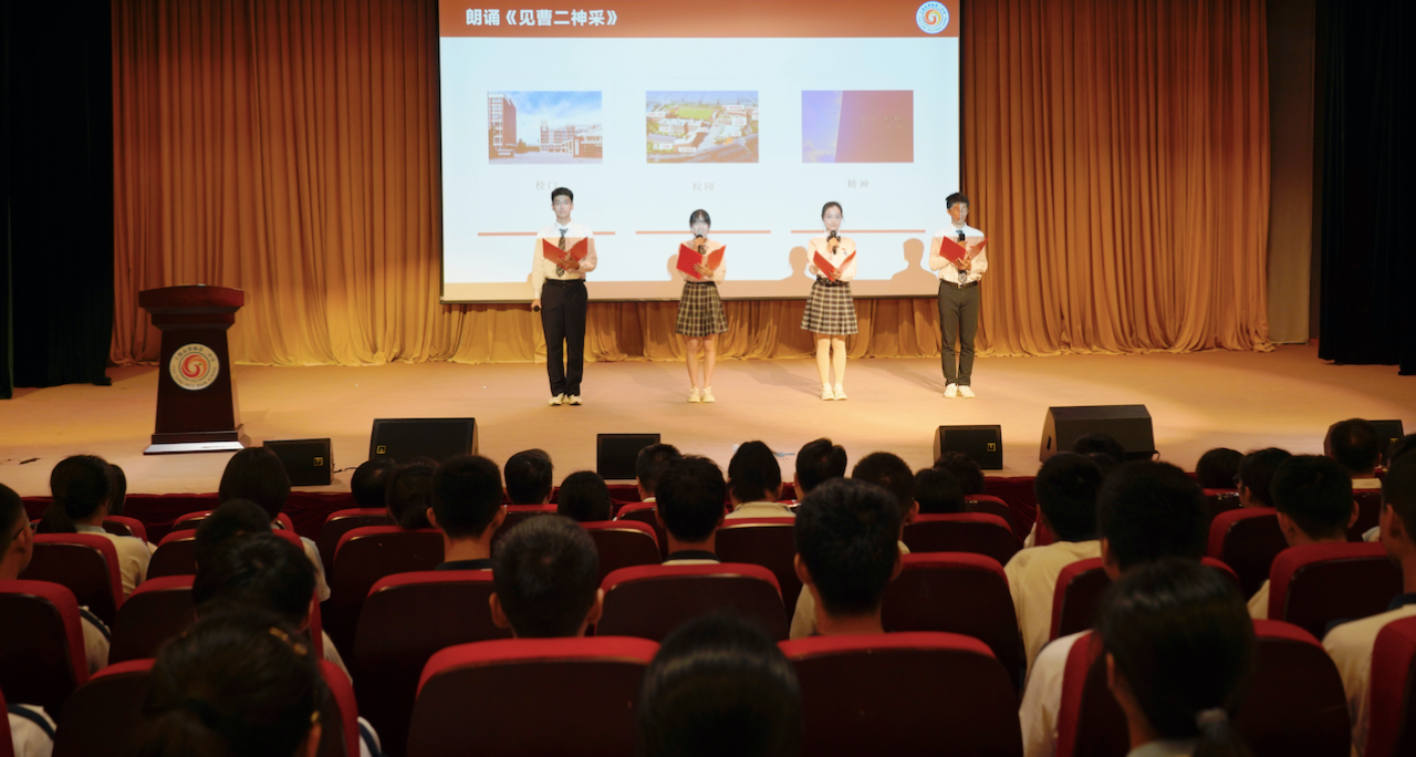 现场,曹杨二中校长周飞致欢迎辞, 2024届考取上海交通大学的优秀学长朱羿帅分享了他的成长故事。剧场内青春活力涌动,四位学生代表带来了主题朗诵《见曹二神采》。他们用饱满的情感和铿锵的语调,表达了对学校红色基因、劳模精神、实践品质、特色课程、社团风采的热爱及学校七十年创业历程的赞美。