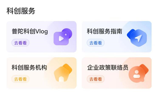 “靠普服”栏目新增“科创服务”板块,整合科创相关服务和资讯资源、整合“中华武数”等各专区,提供一站式“科创服务”。板块包含“普陀科创vlog”“科创服务指南”“科创服务机构”和“企业政策联络员”四大专区,集中展现了普陀区科技创新布局从“一轴一园一中心”向“中华武数”的优化升级,立体式描绘出普陀区科技创新动力不断激活、新动能新优势加速集聚的崭新景象。同时,通过“科创服务指南”介绍普陀“中华武数”科创品牌布局、导览普陀四大科创载体、传递普陀科创资讯,弘扬普陀“科技追梦人”奋斗历程。