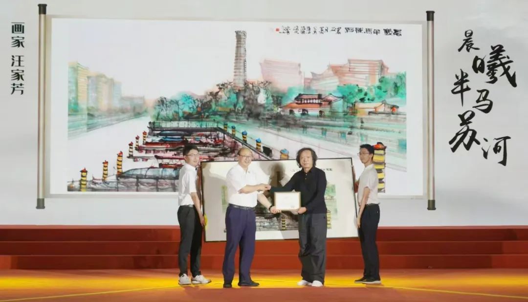 人民政协成立75周年之际,著名画家、十三届区政协特聘委员、国家一级美术师、普陀区美术家协会主席汪家芳用新作《晨曦半马苏河》来表达自己的祝贺之情,并将画作献给普陀。刘东昌为其授捐赠证书。