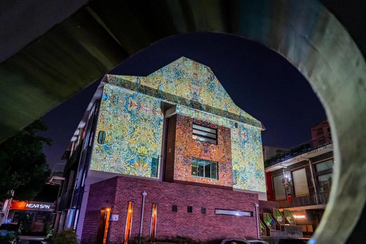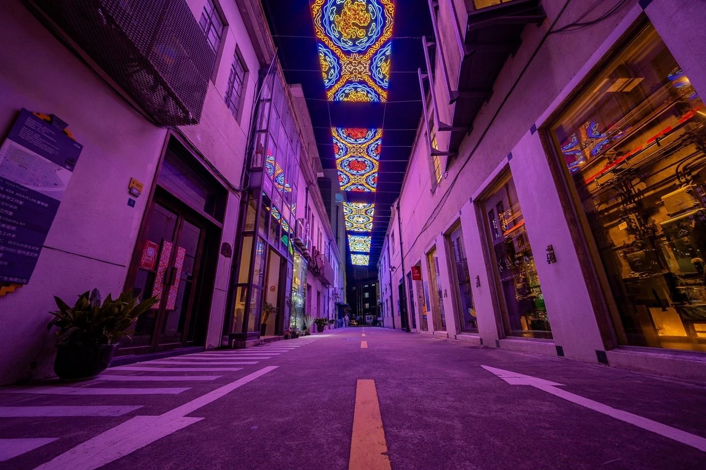 船靠岸后,大家行至M50创意园。在M50,《光锦》艺术展特别以中国传统织锦纹样为主题,以光织锦,借助当代艺术的表达方式全新演绎传统与现代的完美融合。通过灯光艺术装置、雕塑艺术、数字艺术、气膜艺术、夜光涂鸦艺术、媒体内容创作等多种形式,设计14组室内外光影艺术作品,在M50呈现“光影”与“艺术”的碰撞。