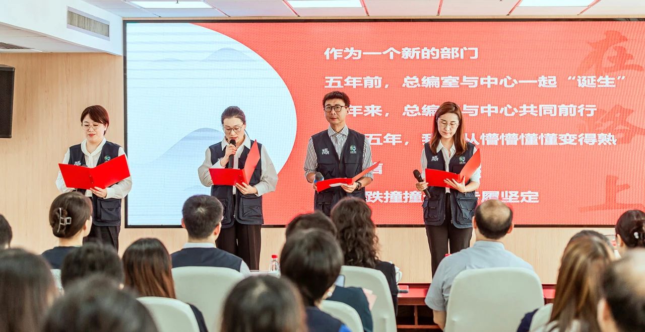 会上,与会人员首先一同观看了中心成立五周年回顾短片。来自区融媒体中心采访部的记者们分别围绕“吾辈”“悟心”“毋我”“无畏”“舞动”五个关键词进行了交流分享,讲述那些关于采访和记录的故事。同时,总编室、编辑部、运营部、技术部和办公室等部门也分别通过不同形式,讲述了五年来与融媒体中心共成长的经历和感受。总编室带来配乐诗朗诵《在路上》;编辑部通过视频演讲风趣幽默地分享了《编辑部的故事》;运营部、技术部和办公室则围绕《以“三真”为本,护航融媒茁壮发展》主题作了交流。