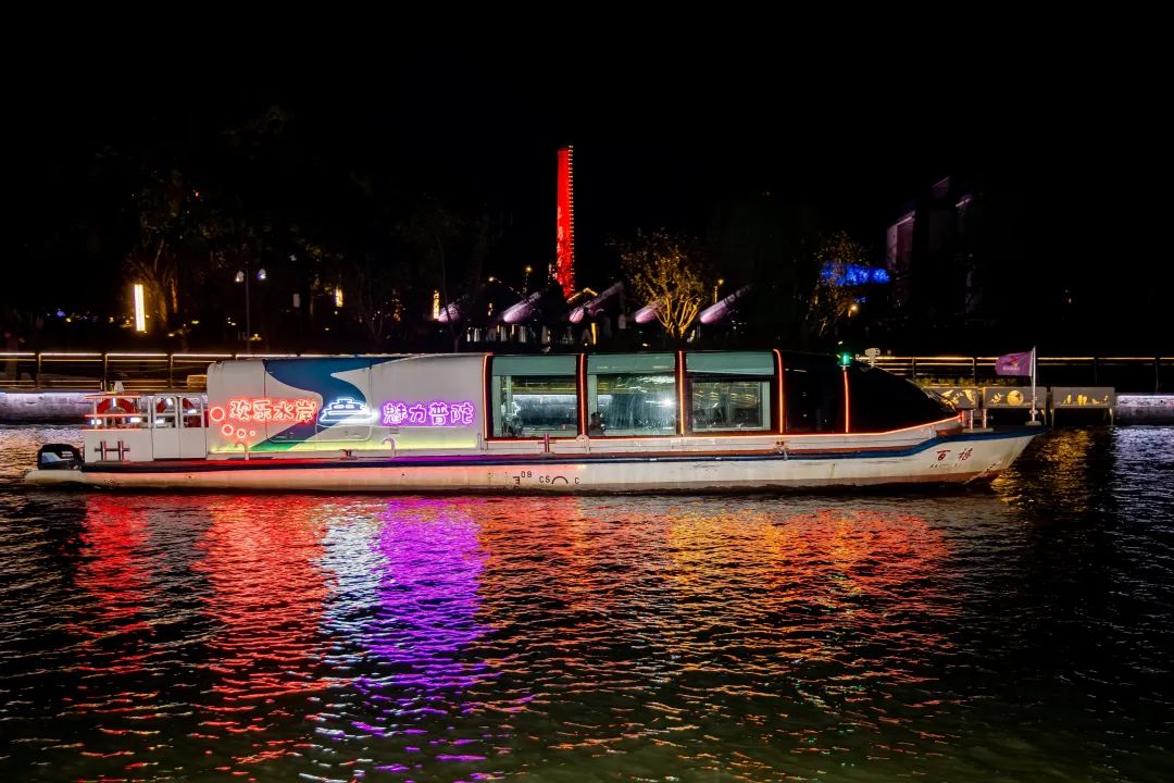国庆节期间,普陀区文旅局联合久事旅游、旅游时报创新推出彩船夜游活动,为“半马苏河”的夜晚增添了一抹亮丽的色彩。4艘装扮有上海旅游节和“半马苏河”文化旅游节相关发光文字和图案的“时光之梭”游船,在夜幕下的长风公园码头和昌化路码头来回穿梭,犹如一条炫彩的荧光飘带,吸引了众多市民游客的目光。同时,苏州河游船夜间航线也正式启航,乘坐着装扮一新的闪光彩船,游客们可以尽情欣赏“半马苏河”两岸的光影舞动,享受独一无二的假日体验。