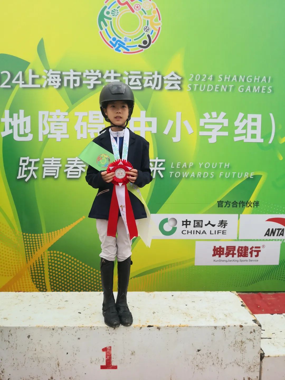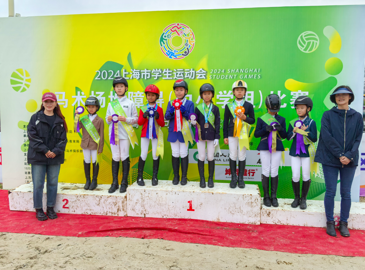 同样在这片充满魔力的赛场上,华外实验的王一墨同学以其坚毅不拔的精神,策骑马匹小青龙,在小学组1-3年级个人赛场地障碍基础赛评分赛中勇夺金牌。四年的勤学苦练,从害怕马背到掌握马术障碍基本技巧,她经历了无数次的失败与爬起。在学运会的赛场上,她与马匹小青龙默契配合,面对高温和体力的极限挑战,她坚持不懈,最终以稳定的发挥赢得了金牌。当她站上领奖台的那一刻,所有的汗水和泪水都化作了胜利的喜悦。