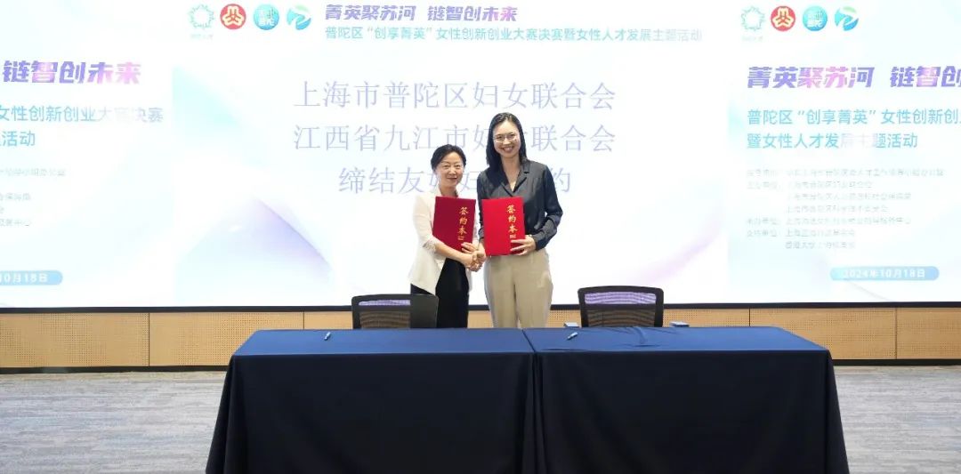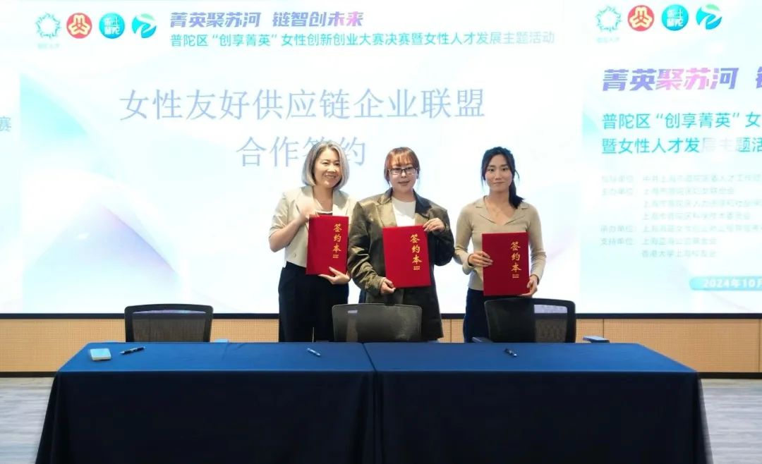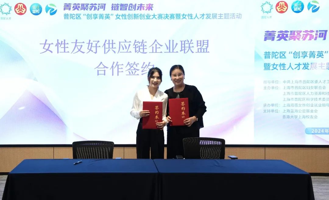 现场,上海市普陀区妇联与江西省九江市妇联共建签约,进一步加强两地妇联组织之间的沟通与协作,共同探索创新妇女工作的方法和途径,推动两地妇女儿童事业的发展。普陀区“女性友好供应链企业联盟”正式成立,将更好地整合资源,为女性创业者们提供全面的支持。现场区内五家企业分别与本次大赛的四个项目达成合作意向,并签订了合作协议。