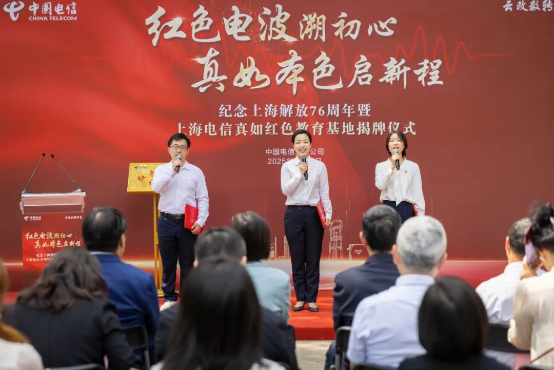 来源: 上海天翼正能量近日,中国电信上海公司举行纪念上海解放76周年暨基地揭牌仪式,市通信管理局党组成员、副局长贺丰,区委副书记周艳,市经信工作党委二级巡视员张成金,中国电信上海公司党委副书记、副总经理、工会主席马明等出席活动。活动现场为“上海电信真如红色教育基地”“红色电信讲堂”揭牌。