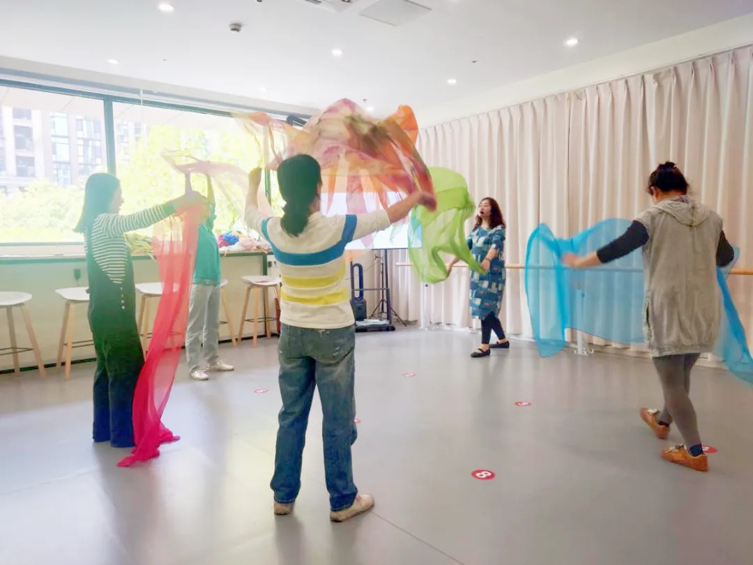 万里街道则凭借《身体知道答案》课程,从“情绪—心智—身体”互相影响切入,揭示身心健康一体化逻辑,强调身体是情绪调节载体,引导体验者通过动作、呼吸与觉知管理情绪。课程中,体验者先通过唤醒感知、呼吸调整释放疲惫,再以“推与拉”等互动活动体验肢体语言、释放情绪压力。还可借助丝巾道具摆出想象的赋能动作,将积极情绪具象化。舞动治疗从身体感受和象征意义两方面表达内心,实现情绪、认知和身体感受整合,从而改善心理问题。