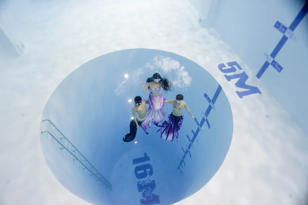 据悉,项目总面积约6000平方米,建设历时36个月。除了16米深的潜水池,这里还配备了真波造浪冲浪池、恒温泳池及专业培训教室,其灯光、水质与空气系统均达国际标准。